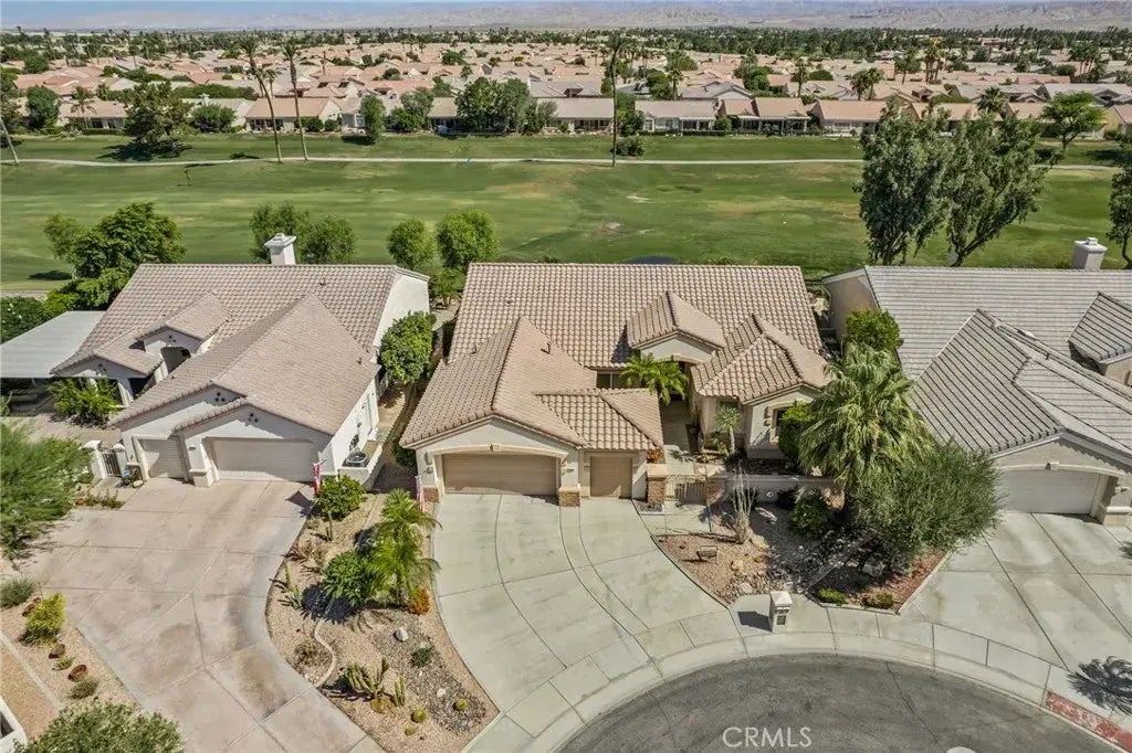 Welcome to this stunning home in the prestigious Sun City community of Palm Desert. Renovated in 2020 and highly upgraded Monaco floor plan with 3 bedrooms and 3 bathrooms, which has golf course frontage to the 5th fairway. Custom double glass front doors open to 12-feet high ceilings, then all glass great room wall with views to the spa and mountains beyond. Beautiful pebble tec with stone veneer waterfall spa that is large enough to accommodate 10 people. Flooring is 20 inch tile in every room with 6 inch high baseboards. Recent kitchen upgrades include granite counter tops, glass-tile backsplash, and double sink. 2 Restrooms have quartz countertops, the third has a pedestal sink, and all water closets have been replaced with energy efficient units. Multiple glass in the windows have been replaced. 2-car plus golf cart garages with storage cabinets, and work bench with 12 drawers. The home has a secure entry courtyard, and the rear yard is beautifully landscaped with palm trees, covered patio, and a wide variety of cactus plants all on drip system(s). The cul-de-sac street location enhances privacy, and the front elevation is further enhanced by a beautiful stone veneer base, which is rarely seen in this community. The home has an evaporative cooler in the garage to help reduce electricity costs. Furniture is available, and to be negotiated outside of escrow. A must see before the fall and its gone!