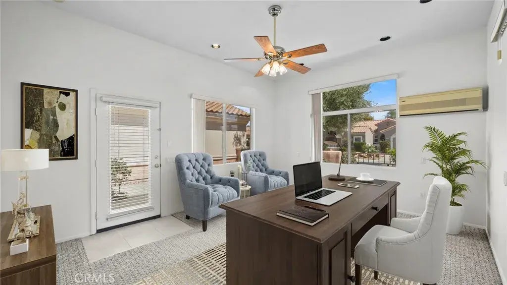 **RECENT IMPROVEMENTS DONE TO THE HOME! Welcome home to Sun City Palm Desert 55+ gated community! Beautifully landscaped grounds with two golf courses, water fountains, and lots of amenities! The lowest HOA dues in the area! Your new home has just had the whole interior freshly painted, windows, carpets and tile cleaned, and is ready for you to move in! This is a permitted 3 bedroom SINGLE-STORY, with the 3rd bedroom having separate access from your FRONT COURTYARD. The curb appeal is noticed the moment you drive up to the low maintenance, rock-scaped front yard that extends the desert right into your home. As you enter, you will see lots of natural lighting and an open floor plan. The kitchen includes a stove, microwave, and refrigerator. Corian countertops, lots of storage, and a kitchen ISLAND are awaiting your chef skills. The family room is open to the kitchen and dining area and have full window views to the back yard patio, along with an attached room that can be used for an office, gym, or playroom! The primary bedroom has an ensuite with DOUBLE SINK vanity, OVERSIZED WALK IN SHOWER, and large WALK IN CLOSET. As you relax out back, you have a patio along with an awning that can provide even more shade for your comfort, with a peekaboo view of the desert mountains. SEPARATE LAUNDRY ROOM WITH WASHER AND DRYER AND STORAGE INCLUDED! CEILING FANS THROUGHOUT. The two-car garage has a little nook that can be used for PARKING YOUR GOLF CART or for additional storage. This is a great floorplan, a great community, and all it needs is you!