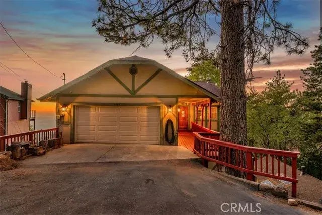 Welcome to this beautiful 3-bedroom, 2.5-bath home nestled in Running Springs with breathtaking views of city lights and the valley below. Upon entering, youll find a level entry leading to the attached two-car garage and a covered entryway that welcomes you into the home. The main level boasts an open-concept living area featuring vaulted ceilings, a stunning floor-to-ceiling rock fireplace with a wood stove, and warm knotty pine tongue-and-groove walls. The spacious kitchen with granite countertops offers modern conveniences with a touchless faucet, USB outlets, a breakfast bar, and an adjacent dining area, perfect for gatherings. Step out onto the large deck and enjoy the expansive views. Downstairs, all bedrooms are situated for privacy and relaxation. The primary suite features a gas-burning fireplace and an oversized shower and large walk-in closet along with private access to a lower deck complete with a hanging porch swingideal for peaceful mornings or evening retreats. Two additional bedrooms share a full bath complete with granite countertops, and one bedroom offers direct access to the lower deck as well. A hidden gem awaits: a secret room accessible through one of the bedroom closets, currently used as extra sleeping space but perfect for a home office, studio, or hobby room. Although not included in the official square footage, this additional 256 sq. ft. area provides flexibility and has its own separate entrance. Recent upgrades include a new insulated garage door, indoor water shut off valve, newer cordless window shades, Kwikset Microban interior doorknobs