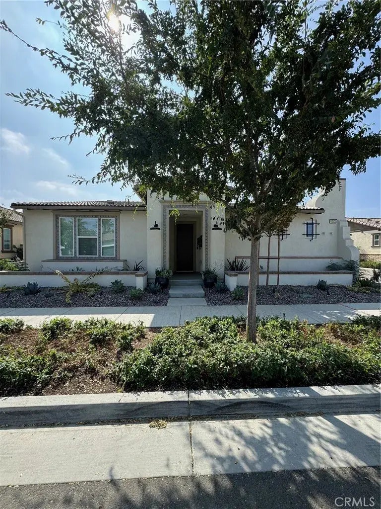 REMODELED Stunning Spanish Home offered at Esperanza, a gated masterplan community exclusively for active adults aged fifty-five and older in Ontario, CA. This community offers the La Jolla Club, a nine thousand square foot clubhouse with a huge swimming pool, spa, fitness center, outdoor/indoor kitchen, pickleball and bocce ball courts. There is also a neighborhood dog park and community garden area. This former model home, with owned Solar, had thousands of dollars of updates and improvements completed just this year. Exterior updates include fresh paint, installation of gutters, and new lighting. It also includes many new upgrades for a minimal maintenance yard: new landscaping with a new drip system, landscaping lighting, outdoor fans, drainage, drought-tolerant plants throughout the yard areas, and artificial turf on the side of the home, which is an excellent spot for any of your pets. Interior updates include all-engineered hardwood floors to provide seamless and durable flooring in all areas, a custom Spanish tile dual shower with handhelds and two shower heads in the main bath, and custom soft-close rollout trays for enhanced storage capabilities. Plantation shutters and custom wood ceiling fans throughout the house. The second bedroom/office has a custom wood wall, and that closet is currently used as an office space (closet doors and accessories are still at the house if someone wants to convert them back to a closet). In addition, the garage has ceiling tote storage to provide additional storage, and there is a tankless water heater with a recirculating pump ins
