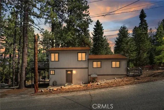 Great cabin on the corner of Club View and Sylvan Glen ~ Plenty of parking with the living room deck doubling as your carport ~ There's room to park your boat or other adventure vehicles ~ The entry level has a bedroom and half bathroom ~ On the next floor you find the kitchen, the second bedroom and full bathroom ~ Up a small set of stairs, you have the elevated living room with vaulted ceilings and rock wood burning fireplace ~ Fresh interior paint, new carpet and wood grain laminate flooring in kitchen and bathroom ~ Walking distance to Bear Mountain ski slopes and golf course ~ Peek a boo view of golf course ~ Awesome cabin for mountain getaways and still close to the lake, Village and shopping!