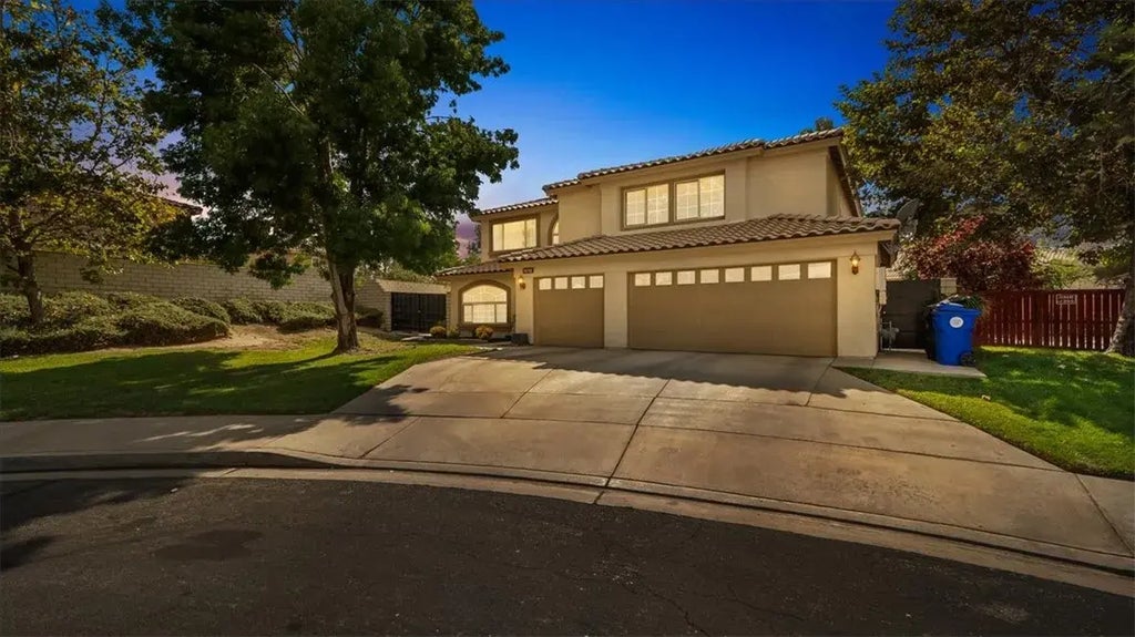 Welcome to this impressive Victorville home, perfectly tucked away on a peaceful cul-de-sac. Step inside to be greeted by soaring high ceilings and newer wood-look laminate flooring that flows seamlessly throughout the first level. To your left, youll find an elegant, open-concept family room and formal dining area bathed in natural sunlight from the large windows. Continue on to the expansive kitchen, featuring abundant cabinet and countertop space, a built-in double oven, and a countertop stove perfect for home chefs. The kitchen also offers an eat-in dining area, ideal for casual meals. The spacious living room invites you to relax by the cozy fireplace or enjoy easy access to the outdoors through the large sliding glass door. With room to accommodate all your needs, this space is perfect for gatherings or quiet nights in. A guest bathroom, ample storage closets, and direct access to the garage complete the main floor. Upstairs, you'll discover a generous loft that opens onto a large balcony overlooking the backyard, ideal for morning coffee or sunset views. The luxurious primary bedroom boasts its own fireplace and a private en-suite bathroom with a soaking tub, stand-alone shower, and plenty of space for relaxation. Additionally, there are three oversized secondary bedrooms and another full bathroom. Convenience is key with an indoor laundry room, while the backyard offers lush green grass, a storage shed, and a spacious side yard with potential RV access. A newer HVAC system, whole-house fan, and solar panels ensure comfort and energy efficiency throughout the year.