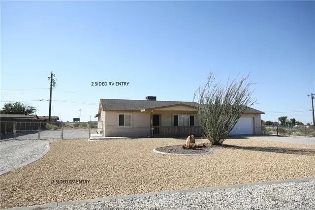 Great house. Home sets nicely back off of the street. Long driveway Has ample RV access and Covered Parking. Sliding glass door from kitchen area leads to a covered patio for enjoying those high desert sunsets. This is an unusual home design. An extra-large Master Bedroom with custom cabinets and a large Walkin closet. Master is unique to being located at the rear of the home and away from the other living spaces. Ceiling fans in bedrooms and living room helps keep the home cool. Plenty of entertaining space along with a no maintenance front and back yard. Close to all shopping schools and freeway. Restaurants / Night Life are in abundance just across the freeway. Quiet neighborhood. Concrete walkways and concrete RV parking in addition to the spacious garage. There are high quality Tuff Sheds on the property that will stay and allows extra storage area. *Dual entry Pull Through* A great benefit to this home is the opposing double gated access that allows you if needed to pull a trailer around the back of the entire home or you could use it for parking your RV or trailers. This is a very low or no Maintenace landscaping yard compared with many that only have dirt yards.