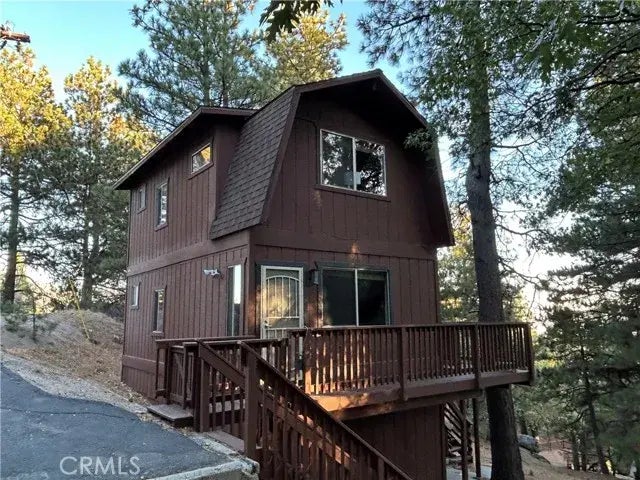 Nestled among the towering pines with views of city lights below is this Running Springs cabin. With 2 bedrooms and 1.5 bathrooms, home has open living concept connecting kitchen to living area, inside laundry and almost level entry. Livingroom has rock fireplace, beam T&G ceilings, and dual access to the wrap-around deck. Enjoy views of city lights below from deck and most rooms. Home sits on 3 lots, with a generous almost 15,000 sq ft, with gentle slope and lots of parking. There is a large storage/workshop space below. Convenient location with quick access to Hwy 330, close to hiking trails, snow skiing, Skypark at Santas Village and more. Come enjoy affordable living in this fabulous 4 season mountain community.