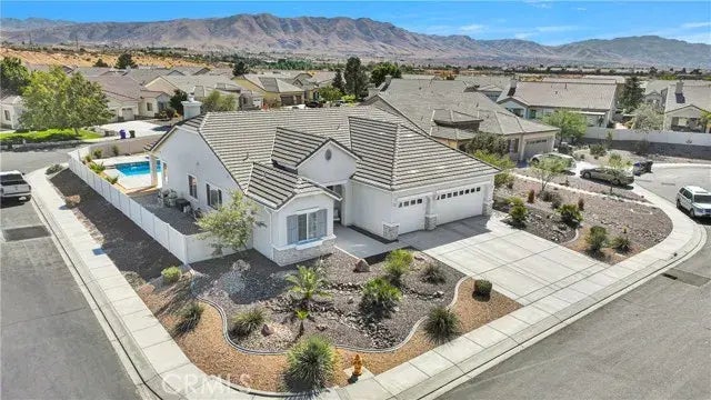 In the prestigious community of The Estates in Apple Valley, this stunning 5 bedroom, 3 bathroom pool home exudes sophistication and style. Every detail of this residence has been meticulously crafted, from the unique light fixtures to the custom-built cabinetry and modernized appliances. The expansive open floor plan is bathed in natural light, thanks to large windows that frame captivating mountain views, creating an inviting and airy atmosphere. The living room, with its cozy fireplace, is perfect for relaxing mornings or enjoying movie nights with a view. Adjacent is the elegant dining room, ideal for family gatherings or entertaining guests, while the chefs kitchen boasts updated appliances, a generous island with a breakfast bar, and abundant storage. An additional dining nook adds convenience for casual meals. The executive suite is a true retreat, offering serene views of the pristine pool and spa outside, all set against a backdrop of scenic mountains. The attached en-suite bathroom elevates luxury with a custom soaking tub, a walk-in shower, dual sinks, and chic fixtures throughout. A separate bedroom and bathroom near the entry provide a versatile space for multi-generational living or a quiet home office. The remaining three bedrooms are bright and spacious, featuring large closets and generous windows, while the shared bathroom includes dual sinks and a spacious walk-in shower. Additional highlights include a laundry room with ample storage and a utility sink, and a 3-car garage offering plenty of room for cars, toys, a home gym, or extra storage, and owned sol