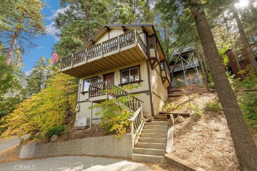 Escape to this cozy cabin nestled among the pines! This delightful home offers an inviting open floor plan that seamlessly blends the kitchen, living, and dining areas. The living room exudes rustic charm with its vaulted beamed ceilings, pine-paneled walls, and a rock fireplace with a raised hearth, perfect for cozy evenings. The first floor features a welcoming living room, a bedroom, a full bathroom, and a convenient laundry room. Upstairs, youll find two additional bedrooms and another full bathroom. The kitchen offers bar seating, making it ideal for casual meals or entertaining. Off the dining the slider access a deck with views of the towering pines. There's also a spacious back deck with a hot tub, plenty of room for lounging & BBQs. Practical amenities include a long driveway for ample off-street parking. Plus, the HOA covers essentials such as trash, sewer, and water. This homes ideal location puts you just a short distance from the historic Tudor House, hiking trails, mountain biking, and sledding, and a quick drive to Lake Arrowhead Village, Skypark at Santas Village, and Snow Valley for winter sports. Perfect as a vacation retreat, investment property, or full-time residencethis cabin embodies mountain living at its finest!