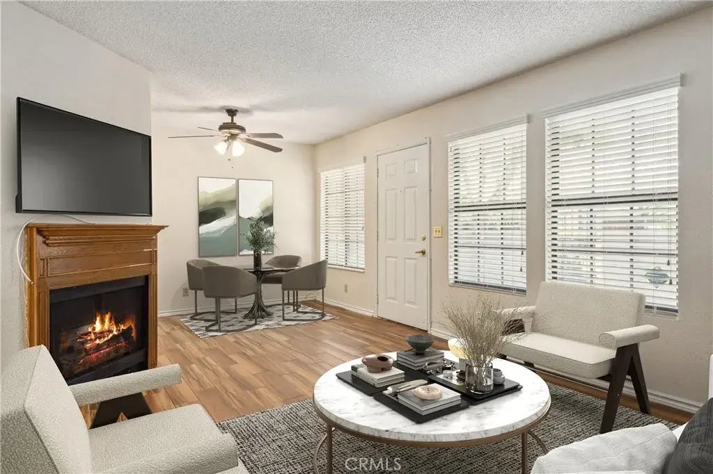 Don't miss this move-in ready condo with 2 bedrooms, 1.5 bath condo located in the desirable La Paloma community of Rancho Cucamonga. Wonderful central location. This home offers 932 SF of living space with a large enclosed front courtyard, a spacious floorplan, and new vinyl plank flooring. The Living Room has a fireplace and there is a Dining Area with ceiling fan. The Kitchen features oak cabinetry with lots of storage space and counter space. Stainless steel appliances including gas range with vent and dishwasher. There is a half Bathroom just off of the kitchen that also has laundry hookups and additional storage space. Both of the Bedrooms are located on the 2nd floor and are generously sized with carpeted floors and vaulted ceilings. The Primary Bedroom also features 2 closets, including 1 walk-in closet, a gorgeous light feature, as as well as direct access to the full-size Hall Bathroom which has a hallway door access for the Secondary Bedroom. Hallway linen storage area, and the bedrooms feature double doors between them. The large front courtyard area has a storage closet and plenty of space for a patio set to relax and entertain guests. This home also offers a detached 1-car garage and 1 assigned parking space. Residents get to enjoy a sparkling pool and spa, and green belts throughout the community with lush landscaping. Water and Trash are included with your HOA fees. Conveniently located near schools, shopping, the 210 Fwy, Victoria Gardens, Ontario Mills, Ontario Airport, and so much more!