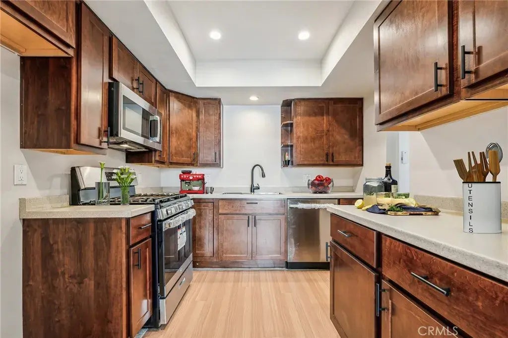 READY TO MOVE IN -Spacious 2br 2ba residence updated with new kitchen and appliances. Great Floor Plan with large rooms and windows. One car garage space. EZ living for commuters near freeway access. High walkability score. Near everything-Costco, Gyms, Amazon Fresh, Walmart, Best Buy. Restaurants of every kind. Walk across the street to the famous Broken Yolk Caf for Breakfast and Lunch. Nice sized balcony that is semi private. Beautiful Mature Landscaping, Pool with Peaceful and green walkways in common areas. HOA includes water, trash, sewer, landscaping, pool maintenance and more. One car garage space. No seller contingencies- Ready For Move In. furnishings virtually staged by Padstyler.com. 165 feet from Bowling Alley. Walk to Blaze Pizza, Lowes, McDonalds, Denny's. 24 Hour Fitness is across street on Lemon. Keep a scooter with a basket in the garage for nearby places.