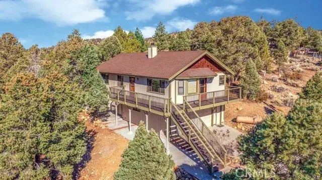 VIEWS and a Rare Attached 2-Car Garage! Prepare to be captivated by extraordinary views from this 2-bdrm, 2-bathrm mountain retreat, offering a rare combination of charm, practicality & seclusion. Set in the east valley above Baldwin Lake, experience panoramic forested & mountain views that will take your breath away. Providing a front-row seat to nature from both the extensively upgraded 400 sq. ft. wraparound deck & the panoramic windows that frame the scenery. Watch birds in flight soaring gracefully or simply bask in the ever-changing beauty of the surrounding landscape. The deck is amazing and its recent renovation includes a newly-built staircase with new handrails, new rim boards, some replaced deck boards and a freshly poured concrete landing. Delivering a fantastic space to gather with friends or family, experience stunning sunsets or simply soak in the sweeping scenery. There is a level patio area in the back that is a wonderful spot to bbq, entertain and restore. The exterior was just freshly painted. The homes interior exudes cozy mountain charm with rustic wood detail, complementing its natural setting. The open-concept living area features a cozy free-standing wood stove, a nice kitchen + a separate pantry! The large windows fill the space with natural light and provide breathtaking views. A bay window seat offers a cozy spot to sip your coffee, read a book or enjoy the tranquil setting. Convenience is yours with a washer & dryer located inside the home and direct-access to the attached 2-car garage that includes a workbench, making everyday tasks easier. The