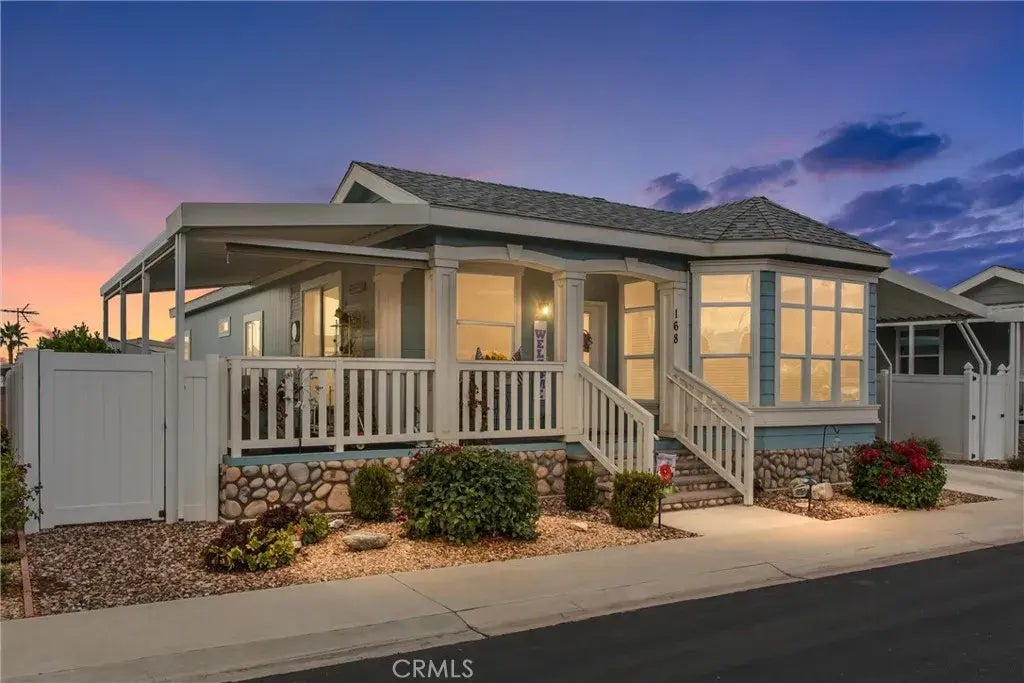 This lovely home is situated in a park, but it feels very private as it's situated along the farthest easterly street in a row of all newer modulars. There are no neighbors across just a beautiful view over the wall of the majestic mountains. Stepping inside this home you will enjoy how light and airy it is, especially with the high vaulted ceilings. The delightful kitchen is highlighted with a spacious island which includes slide out shelves and a great breakfast bar. The ample white cabinetry makes the designer backsplash and white Corian counters standout. The dining area has a wonderful bay window as you enjoy your morning coffee and all your meals facing our wonderful mountain range. The microwave, side by side refrigerator and washer and drying of course will be included in the sale. There is even a walk in pantry in the laundry room. These newer homes all have fire protection sprinkler systems along with the smoke protectors. Walking out of the living room through the sliding glass door takes you out to your own private covered patio, then down the steps into the garden and a gazebo for those relaxing moments. At the end of the two car carport is a shed which is great for storage and garden equipment. Don't miss out because at this price this lovely home won't last!!