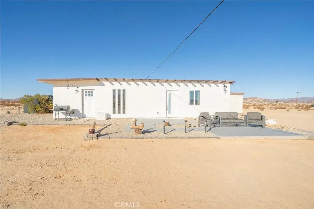 Welcome to Gopher Road in 29 Palms! A single family residence (SFR) NOT a cabin! Where tranquility meets modern living on a serene 5 ACRE LAND. This recently renovated residence exudes an AirBnB aesthetic, characterized by vertical windows that infuse the living space with contemporary elegance and abundant natural light. The bathroom is a standout feature, showcasing floor-to-ceiling tiles and a chic vanity fitted with a premium faucet. Cdustom gorgeous glass and maple french doors, Newly installed horizontal clerestory windows, custom gorgeous glass and maple french doors, provide stunning horizon views while ensuring privacy and reducing direct sunlight exposure. An outdoor patio serves as a perfect retreat for savoring morning coffee at sunrise and enjoying the night sky's beauty. The presence of government-owned land nearby guarantees a peaceful atmosphere, free from disturbances. The breathtaking panoramic vistas of the mountains within Joshua Tree National Park enhance the property's allure. Although enveloped by vast wilderness, the famous Palms Restaurant, celebrated for its live music, is conveniently located just minutes away. Situated in the emerging Wonder Valley, this property offers a respite from the bustle of tourists and traffic, capturing the quintessential Joshua Tree spirit that attracts individuals from across the nation and beyond, all in search of nature's tranquility and a sense of communitywhile still being a short drive from the shopping and dining options in downtown 29 Palms.