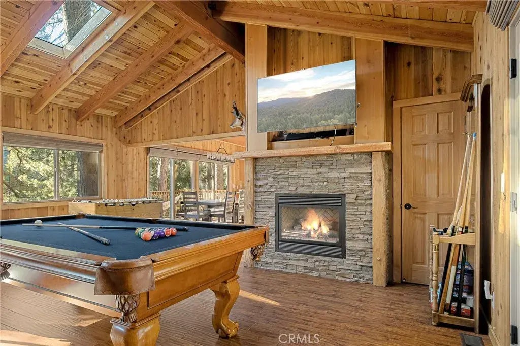 Beautiful, well cared for modified Bavarian with vaulted ceilings and 4 bedrooms in coveted location. This home will capture your heart with beautiful wood tongue and groove walls from the moment you walk in. There is a bedroom on the main, and full bath, updated kitchen with granite counter tops, stainless appliances, and bar top eating area open to the living/dining room. There is a main living room with fireplace and a family/game room with gas fireplace, vaulted ceilings and skylights to capture that natural light. Downstairs you will find a bedroom with 3/4 bath on-suite and private deck. Upstairs is 2 larger bedrooms both with vaulted ceilings and full bath. Inside the build up is a large storage area along with the laundry hookups. There is a deck right off the main floor, made with composite material allowing you to take in the treehouse setting. Home is also equipped with AC, many updates throughout including dual pane windows and newer electrical panel. The homes location is close to Highway 18, the Lake Arrowhead Village, brewery, lake trails and more. You are located within Lake Rights and this home has been a successful short term rental and will come fully furnished. Don't pass this one up today.