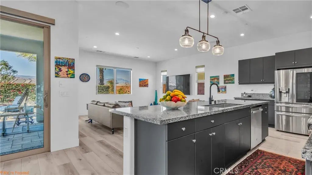 Available April 2025 furnished with spectacular mountain views and an exceptional outdoor space? Welcome to Trilogy Polo Club, where this beautifully upgraded home, situated on an oversized 11,600 sq. ft. corner lot, offers stunning west-facing views and an expansive backyard perfect for relaxing or entertaining. Located in the exclusive 55+ section of the community, this highly desirable Excite floor plan features 2 bedrooms, 3 bathrooms, and a versatile den that can serve as a home office, guest room, or third bedroom. The open-concept great room design is bright and inviting, showcasing luxury vinyl plank flooring, recessed LED lighting, ceiling fans, and upgraded cabinetry with soft-close doors and drawers. Premium energy-efficient features, including solar panels and IID service, help keep utility costs low, while a water softener and filtration system provide added convenience. Two large rolling glass walls in the great room and dining area open to an oversized covered patio, creating a seamless indoor-outdoor flow ideal for entertaining or relaxing. The gourmet kitchen is designed to impress with GE stainless steel appliances, an LG ThinQ French door refrigerator, granite countertops, an oversized island with seating, and ample storage. The spacious primary suite offers a walk-in closet with a custom California Closets organization system, while the upgraded laundry room, complete with an LG washer and dryer and custom cabinetry, adds extra functionality and style. Step outside to your private outdoor retreat, where youll find low-maintenance desert landscaping, an e