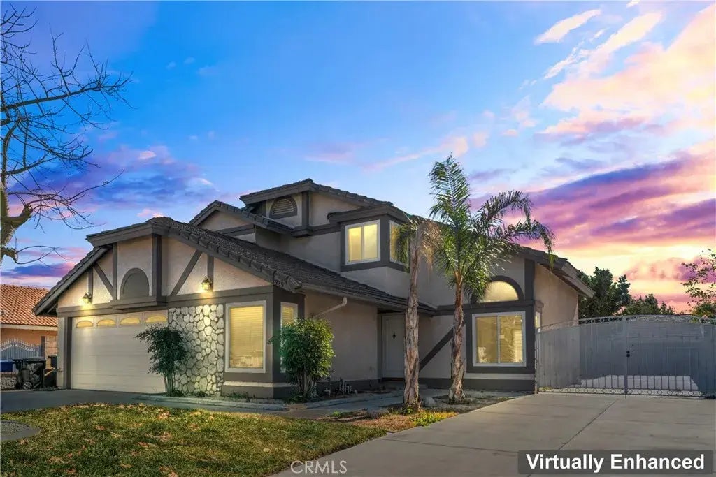 Great Cimmeron Ranch two-story home, conveniently situated close to freeways and universities, while still offering the tranquility of this desirable neighborhood. This home features three specious bedrooms, two and a half bathrooms, vaulted ceilings, open floor plan, glass door kitchen cabinets, french doors and fireplace in family room, en suite primary with balcony and custom stained glass in bathroom, two RV parking spaces (one with hookups), mountain views, and situated close to a community park. The spacious yard features block walls, concrete patio, wrought iron fencing, custom concrete curbing, and fruit trees.