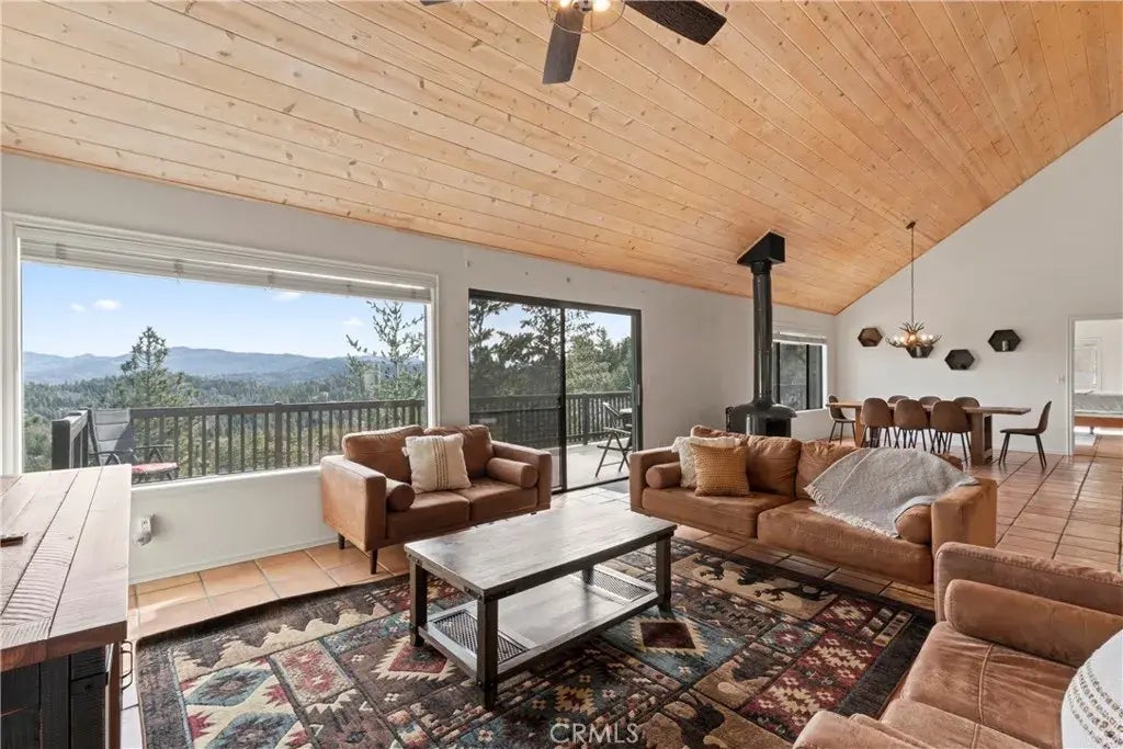 Absolutely breathtaking, unobstructed views of Lake Arrowheads Grass Valley basin and Eastern mountains toward Big Bear! Located in Lake Arrowheads Summit neighborhood(underground utilities) with full lake rights, this picturesque setting replicates something you would find in the High Sierras. Located on a acre parcel, offering a feeling of total seclusion yet conveniently located near Hwy 18 for commuters and a short drive to the Lake Arrowhead Village, Blue Jay and Country Club. Experience ample level parking from this low traffic County paved and maintained road. Not one step into the house here, level entry from a spacious driveway & 2 car garage, truly a huge amenity within the mountainous topography. Upon entry you are greeted with an enormous open concept main living level with a stylish Swedish freestanding fireplace and East facing wall of glass capturing massive views everywhere you look. A large primary en suite bedroom located on the main level offers vaulted ceilings and wall of windows welcoming the most beautiful sunrises each morning. Main level offers two dining areas and updated kitchen with solid surface counters, stainless appliances and double oven. A massive entertainers deck spanning 61x11, perfect for holiday BBQs with family and friends. Middle level is a kiddo gaming paradise offering new vinyl flooring throughout, 3 guest bedrooms, 2 bathrooms, laundry room and independent kitchenette! Lowest level boasts a billiards room and a super private large 5th bedroom and full bathroom. Amenities include upgraded lighting, A/C(recently installed) and nat