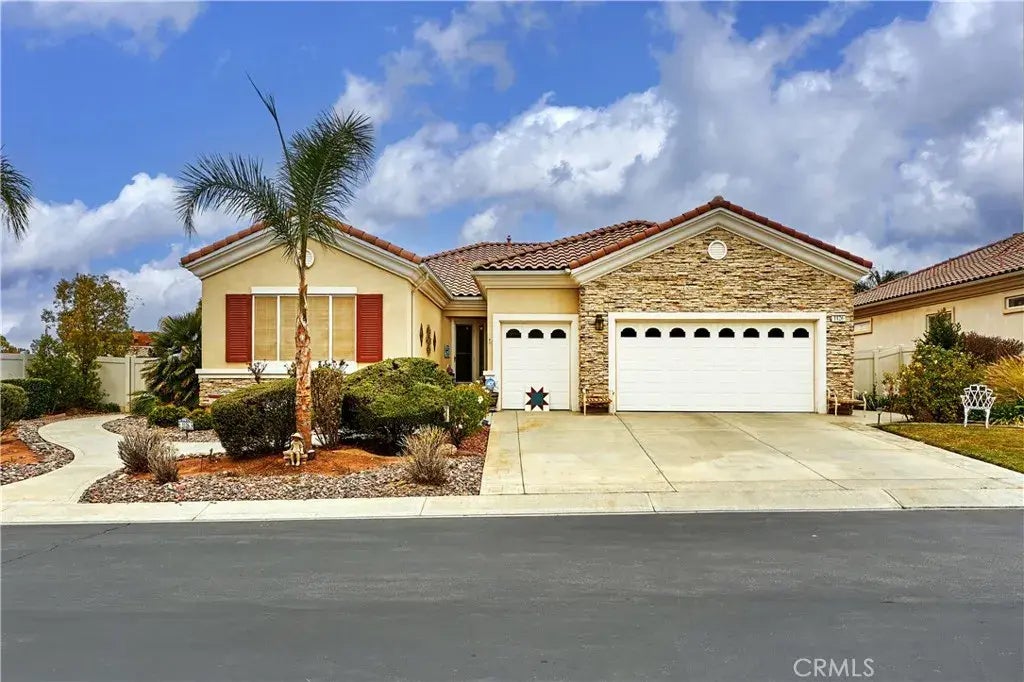 HIGHLY UPGRADED Emerald home in the 55+ gated community of Solera. INSIDE: Stained-glass front door entry with security screen door. Gorgeous stained-glass patio French doors leading to a screened permitted SUNROOM. Granite countertops in the kitchen. Custom stained kitchen cabinets with additional pull-out shelves. Stainless steel appliances stay with the home. Built-in 12 ft. buffet in dining room. The REMODELED primary bathroom includes a large built-in storage cabinet, walk-in shower and custom closet. French doors have been added from the master bedroom to the back yard patio. Plantation window shutters throughout. Built-in desks/cabinets and a Murphy bed for your guests in the den/office. Lots of storage in the garage. OUTSIDE: Very private 13,939 SF corner lot. SPA with newer pump. WATERFALL; covered patio; pergola; dog- run on side of the home; 2-yard gates; low maintenance side yard is large enough for a pool. Solar is leased at $170/month. The Solera 55+ community has a pool, spa, clubhouse, indoor gym, indoor walking track, tennis courts, billiards, meeting and banquet rooms, bocce ball, mailroom, library, classes, clubs, group trips and excellent 24-hour security. Basic Spectrum cable and internet are included with your HOA. Solera is close to Palm Springs, Redlands, the scenic mountain town of Oak Glen, Cabazon Outlet Malls, Morongo Casino and the best golf courses around. Solera is also preferred to the other Beaumont 55+ communities because of close, easier freeway access. Beaumont has a small town feel but with access to all there is to see and do in beautif