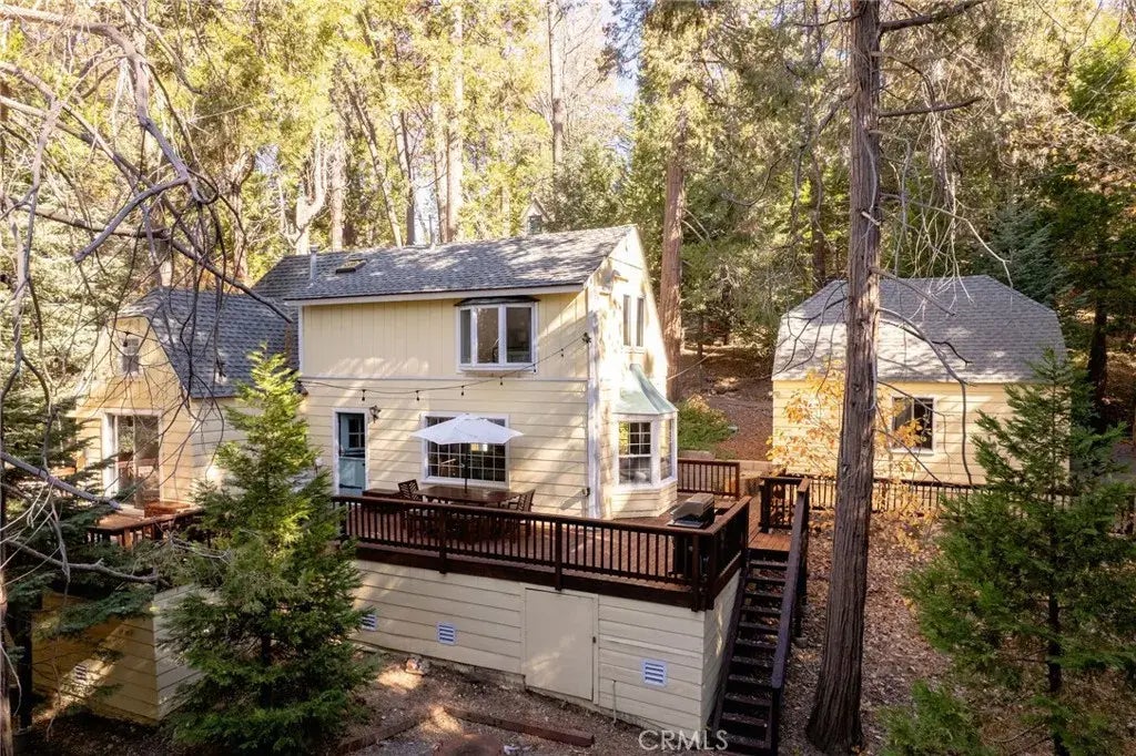 Accepting Backup Offers! This quintessential Lake Arrowhead Charmer is located a stone's throw from the lake in an idyllic forested setting. This property boasts a level driveway and level entry into the home. Once inside, you're greeted by a cozy living room with knotty pine wood paneling, a large brick fireplace as focal point and picture windows with views of the towering pines and cedars outside. There is a full bathroom, stackable laundry closet and bedroom on the main, that opens onto the inviting back deck with a jacuzzi tub nestled amongst the trees. The kitchen has been tastefully updated to compliment the home's original character with forest green cabinets, butcher block countertops and an antique, operational stove! Upstairs are two well appointed bedrooms, one of which has beautiful skylights to take in the beautiful surroundings whilst snuggled up in bed. The other has a bonus nook - perfect for an additional sleeping- or play area. You'll also find another full bathroom on this level. Outside there is a detached recreation room with large fireplace and built-in cabinetry. Recent upgrades include a new main sewer line, mini-split air conditioning on the upper level, water heater and newer appliances. This property offers lake rights and excellent proximity to local attractions such as the Lake Arrowhead Village, the lake trail & Orchard Bay, Skyforest & SkyPark.