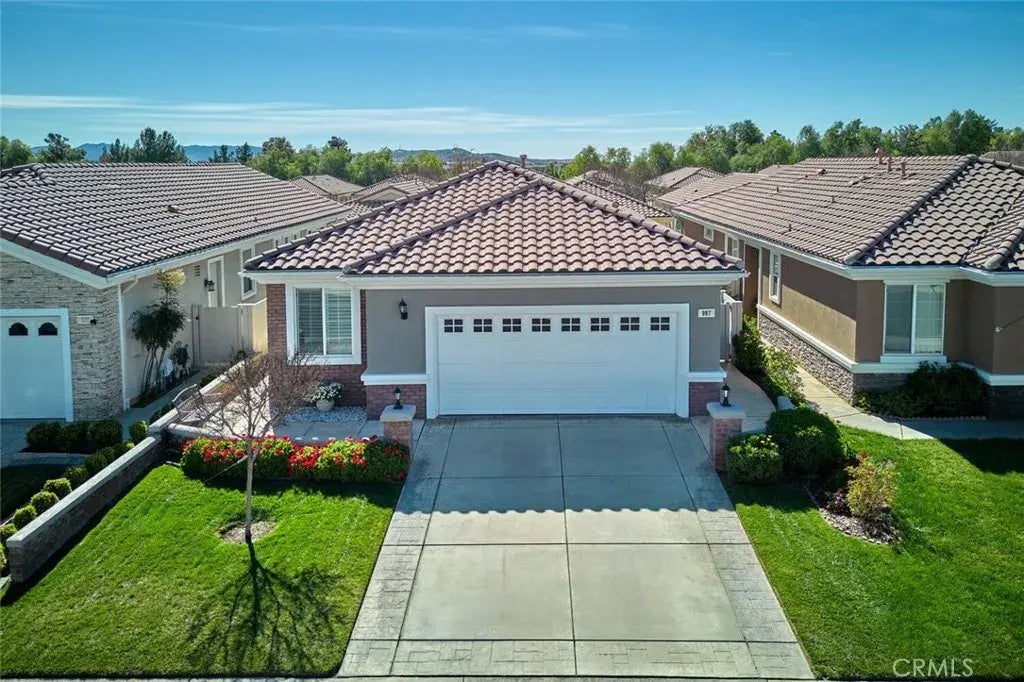 This stunning 55+ Solera home boasts a wealth of desirable features, starting with its beautifully maintained front patio, perfect for enjoying morning coffee or evening sunsets. The exterior has been freshly painted. Step inside to discover the inviting interior, featuring attractive laminate flooring throughout the main living areas, complemented by plush carpeting in the bedrooms for added comfort. Elegant crown molding and large baseboards add a touch of sophistication, enhancing the home's overall aesthetic appeal. The kitchen is a highlight, showcasing white kitchen cabinets, stylish backsplash and custom lighting that create a warm and inviting ambiance. The kitchen is further equipped with top-of-the-line stainless steel appliances, all of which are included in the sale. The updated Corian countertops offer both durability and a sleek, modern look. Privacy and light control are ensured with plantation shutters gracing every window. The master bathroom has undergone a complete transformation. The home's appeal extends outdoors to a covered patio, providing a shaded retreat for relaxation or entertainment. The low-maintenance yard requires minimal upkeep, allowing you more time to enjoy the comforts of your new home. This property truly offers a blend of style, comfort, and convenience, making it an exceptional find. Residents of Solera enjoy a range of amenities, including a pool, spa, clubhouse, fitness center, indoor walking track, tennis courts, library, billiards, and bocce ball, along with various clubs and activities. Spectrum cable and internet are included wi