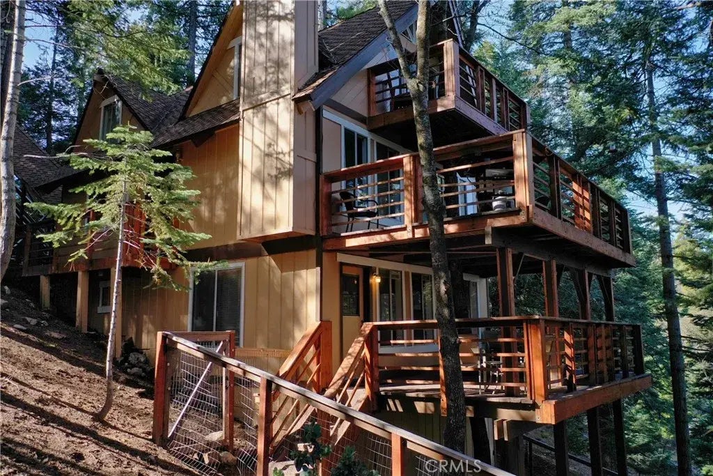 Nestled amongst a forest of tall evergreen trees on .35 of an acre parcel, the Augusta Tree House is a charming 3 bedroom/3 bathroom, Bavarian style cabin providing a tranquil environment for those looking to escape their busy work week to a fairytale mountain setting. Located in Arrowhead Woods, including full lake rights to private Lake Arrowhead and located on a low traffic County paved & maintained road. Upon entry of the main living level you are greeted with 2 walls of windows which accentuate an authentic tree house ambiance. Relax within open beamed Tongue and Groove ceilings and a cozy wood burning fireplace. A corner kitchen features a newer 5 burner stainless electric cooktop and microwave, brand new stainless fridge, luxury vinyl plank flooring and breakfast bar top. A spacious entry level primary en suite bedroom and full bathroom conveniently located off the living room. Upstairs, guest will enjoy 2 spacious bedrooms(each with private decks attached) vaulted ceilings, and a full bathroom with a subway tiled shower. The icing on the cake, the lower level hosts a spacious billiards game room, half bathroom and 2nd attached deck overlooking the fenced yard below. A nice sized laundry room with full size appliances provides ample interior storage space. Since sellers acquired the property in 2020, upgrades include: replaced water heater, rebuilt all decking floorboards and handrails, Ring camera system, replaced lighting fixtures, added the fenced yard with 2 gates, and painted exterior with high quality paint. Offering a very functional floorplan near the Lake Ar