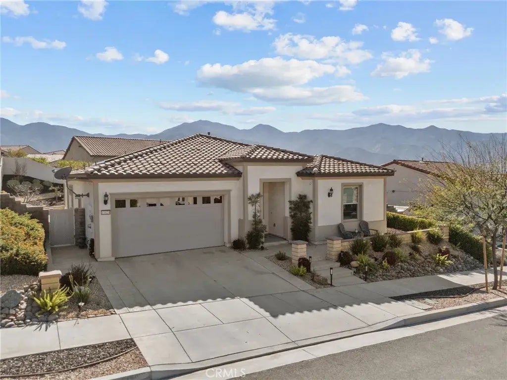 This home looks like a MODEL HOME! Experience resort-style living in this stunning 2 bedroom, 2 bathroom, single-story home with a den/office space, located in the prestigious guard gated 55+ community of Terramor. This beautifully upgraded home offers an open-concept design, modern finishes, and a professionally landscaped front and backyard with peekaboo mountain views. Step inside to find high ceilings, recessed lighting, and gorgeous flooring throughout. The kitchen has quartz countertops, a designer tile backsplash, white cabinetry, a spacious center island with a breakfast bar and stainless-steel appliances. The dining area is right off the kitchen, with a sliding glass door opening up to your gorgeous backyard. The primary suite is a luxurious retreat with a bathroom featuring dual vanities, an oversized frameless glass walk-in shower as well as a generous walk-in closet. The second bedroom is bright and welcoming, while an additional bonus room with French doors offers flexibility as an office, den, or guest space. The separate laundry room includes a sink and ample cabinet storage. Outside, the low-maintenance backyard is designed for relaxation and entertaining, featuring a covered California room, gas fire pit, artificial turf, custom retaining walls, beautiful plants and fruit trees, all while enjoying breathtaking peekaboo mountain views. Additional upgrades include upgraded flooring, custom window coverings/drapes, solar for energy efficiency and tankless water heater. As part of the highly sought-after Terramor community, residents enjoy access to two exclusi