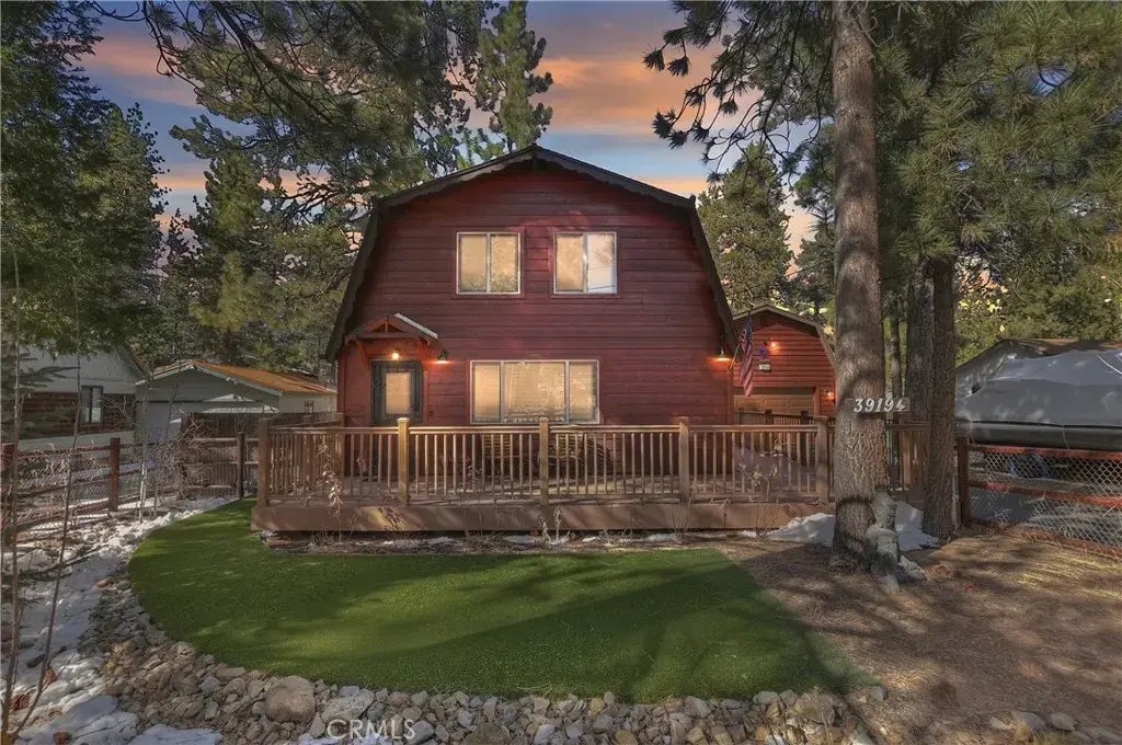 Exquisite Gambrel-Style Retreat in Boulder Bay ~ Discover unparalleled craftsmanship and modern luxury in this stunning home, fully remodeled in recent years with every upscale feature imaginable ~ Nestled in the highly sought-after Boulder Bay neighborhood, this residence offers the perfect blend of timeless charm and contemporary convenience, just moments from all that Big Bear has to offer ~ A wraparound Trex deck welcomes you, fully landscaped yard providing the perfect space for outdoor relaxation while enjoying the serene mountain surroundings. The newly built, oversized two-car garage (fully permitted) boasts an 8-foot door, soaring 9.5-foot ceilings, and full electrical, ensuring ample space for vehicles, all the mountain toys and additional storage~ A brand-new Tough Shed adds even more functionality ~ Inside, sophistication meets comfort with three large bedrooms ~ dual-pane windows adorned with elegant shutters, and an alarm system for added security. The remodeled kitchen and baths reflect the highest standards of modern living, while a stackable washer and dryer and an efficient tankless water heater provide the ultimate convenience ~ The fully landscaped front and backyard, complete with an automatic irrigation system and thriving fruit trees, create a lush and inviting outdoor oasis. Whether you're seeking a full-time residence or a luxurious mountain retreat, this home is a rare find in a premier location ~ Experience mountain living at its finest!