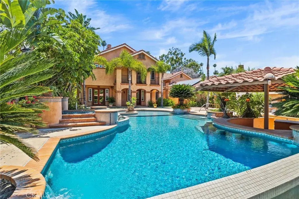 Luxurious Spanish Mediterranean Luxury Estate has EVERYTHING to offer! Almost 6,000 SF feet of elegant living space in the Main House + an 800 SF Detached Casita/ADU! It's Nestled in a distinguished neighborhood in South Corona & sits on almost an Acre of land! This Privately Gated Property offers, Lifestyle, Beauty, Comfort & Space! Stepping into the Grand Foyer, you will experience the Exquisite Marble Flooring that adorns most of the home! The Dramatic Domed Ceiling Formal Living & Dining Room are captivating! An adjacent private Study shares a Fireplace with the Living Room. Natural Light floods the interiors of this gem through Countless Windows, providing flowing Natural Light throughout this palace! The Open Concept Kitchen & Huge Family Room & Fireplace, are Palatial! Boasting Subway Tile Backsplash, 60 Gas Range, Sub-Zero Fridge, Cabinets galore, Wine Drawer Cooler, gated Wine Vault Wall, this area is perfect for creating Cuisine Masterpieces. Up the Front Spiral Staircase youll find the Theater entertainment/media room featuring acoustically enhanced ceilings with surround sound system ensuring optimal sound for movie night! Down the Hallway lies the Majestic Primary Bedroom featuring exquisite curved entry doors, Romantic Fireplace, Balcony & Panoramic View of your Tropical Backyard Paradise! The Spa bathroom features a multi-head, Jetted walk-in shower, large Jetted Bathtub, Two Large Walk-In closets and dual sink vanities. Three more Large Bedrooms feature Ensuite Bathrooms & one has a balcony! Solid Wood Entry & Closet doors are throughout! The Back Stairway f