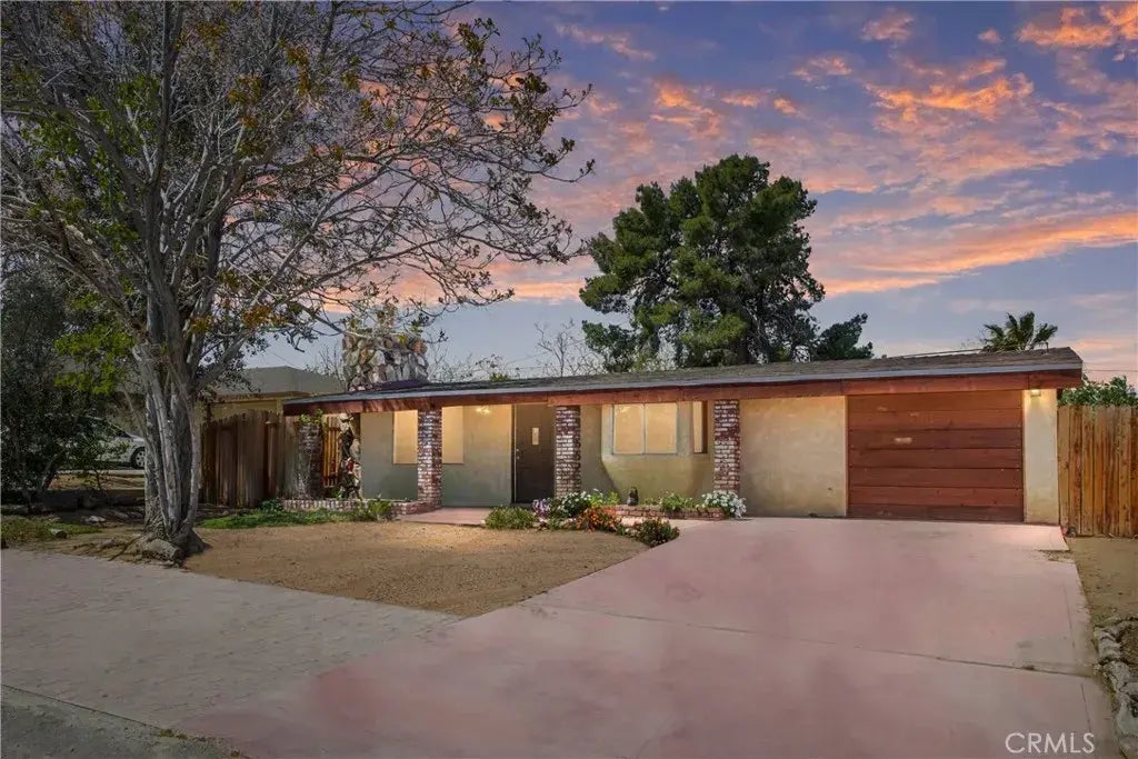 Welcome to this beautifully updated 3-bedroom, 1-bath home offering 1,232 sq. ft. of comfortable living space. Thoughtfully designed with an open-concept layout, this home features a stylish kitchen and dining area, complemented by an elegant stone fireplaceideal for cozy evenings at home. The spacious family room is filled with natural light and showcases exposed beam ceilings, recessed can lighting, and sliding doors that lead out to a private patioperfect for entertaining or relaxing outdoors. The primary bedroom includes a generous closet, ceiling fan, and a convenient vanity with sink, offering both comfort and functionality. One of the standout features is the converted garage, which now serves as a third bedroom while still providing an enclosed laundry area with washer/dryer hookups, built-in cabinets, and a functioning garage door for additional access or storage. New roof recently installed. Located in a prime area close to town, schools, and just minutes from Joshua Tree National Park, this home combines convenience with charm. Don't miss your chance to own this move-in-ready gempriced to sell and ready for its next chapter. Be sure to check out the virtual tour and call today to schedule a private showing! New wiring (16K), new roof, new water heater, and sewer connected.