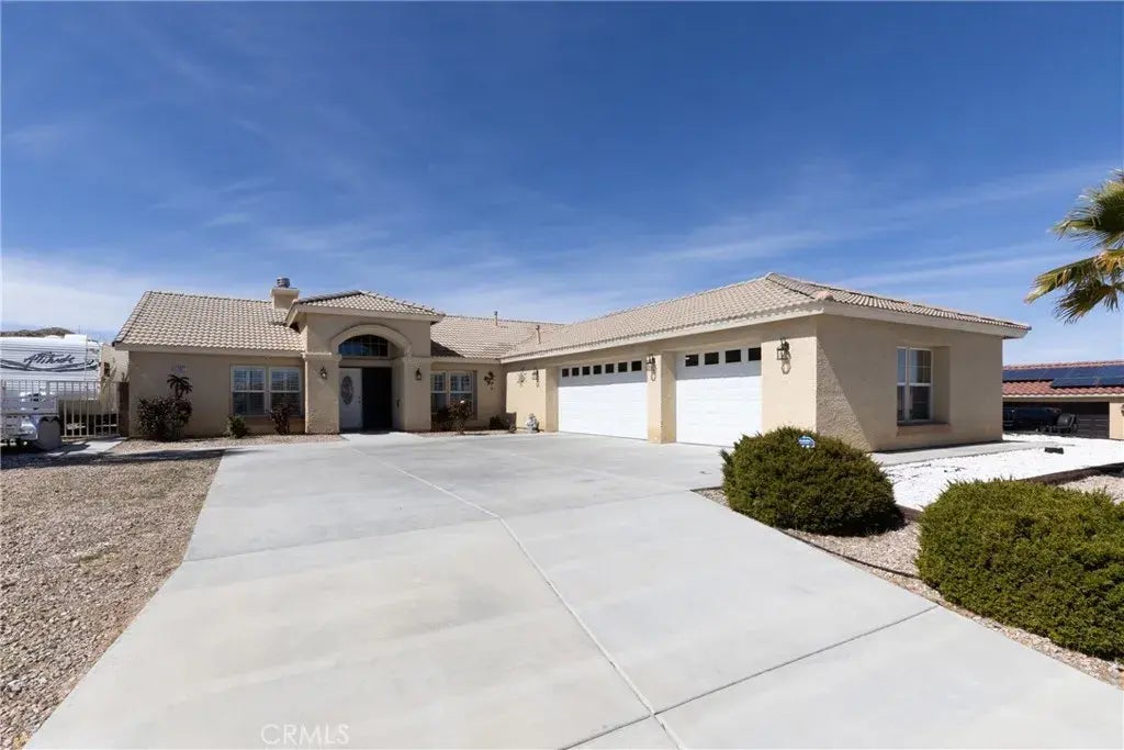 Large 4 bedroom 2.5 bath single story home with a huge 3 car garage with RV access in a welcoming neighborhood. No HOA dues. Large lot with spacious side yards, extended driveway and plenty of room in the backyard. Beautiful views as well. Less than 5 minutes to Yucca Valley High School and about a 15 minute drive to the Joshua Tree National Park Visitor Center & then just another 10 minutes to the west entrance of the park. Home has lots to offer including separate living room and family rooms. Large kitchen with island, granite countertops, double oven, built in microwave and stainless steel sink and included refrigerator. Home has many upgraded features throughout including plantation shutters, laminate and tile flooring, ceiling fans, double sided gas fireplace, recessed lighting, raised panel doors, interior laundry room and lots of hall cabinets. Spacious primary suite with sliding glass door to covered patio, large bathroom with jetted tub and separate shower, double sinks and walk in closet. There is room for everyone, come and see!