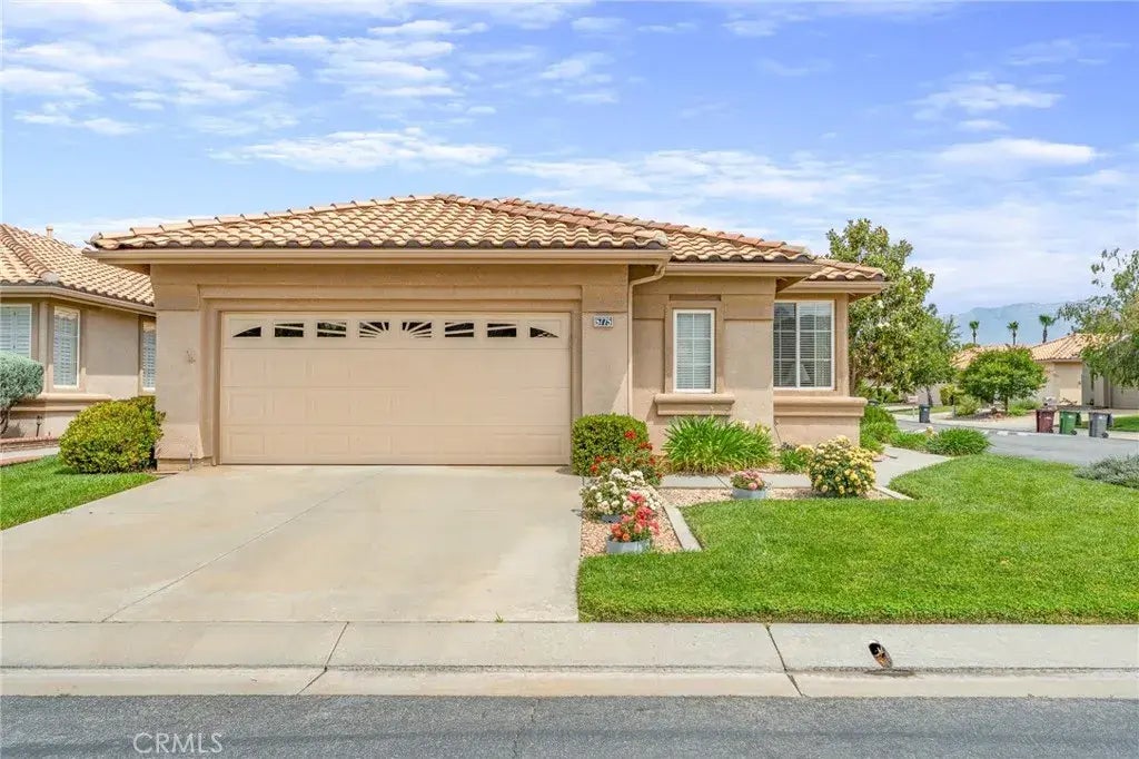 Corner Lot "Columbine" in Sun Lakes Country Club. Original Owner has maintained this home beautifully! 2 Bedrooms plus a Den/Office. The Kitchen is open to the Dining Room and Living Room. Tiled Flooring in Entry, Kitchen, Den, Dining Room, Baths and Laundry Room. Kitchen has New Plumbing and Faucet, Cabinets Galore, Gas Stove, Built-In Microwave, Dishwasher and Breakfast Bar. Living Room has Gas Fireplace with Electric Starter and Ceiling Fan. Primary Bedroom has View of Mountains, Walk-In Closet, Ceiling Fan and Slider that leads to the Back Yard. Primary Bathroom has Double Sinks, Walk-In Shower and Privacy Door to the Newer Commode. Guest Bedroom is Spacious and has Ceiling Fan. Interior individual Laundry Room includes Washer and Dryer. Back Yard has Patio Cover, Vinyl Fencing and Lush Plantings. View of San Gorgonio Mountains from Back Yard. Oversized Garage has New Epoxy Floors and Niche for Golf Cart. HVAC system was replaced with Lennox A/C and Heater in 2021 and has yearly regular tune-ups. A short walk to the South Clubhouse with Indoor Pool/Spa, Tennis Courts and Gym. Sun Lakes Country Club is an Active 55+, Gated Community with Controlled access and 24-hour Guard. Amenities include: 2 Private 18-Hole Golf Courses (Championship and Executive courses), Pickle Ball Courts, Tennis Courts, Bocce Courts, Billiard Room, 3 Club Houses, 3 Pools/Spas, 3 Gyms, 2 Restaurants, Lounge, Full Bar, Veranda, Craft Room with Kiln, Ball Room, Driving Range, Putting Greens and RV parking/storage is available at a very low cost. HOA Dues include Cable TV and Internet. There are a wi