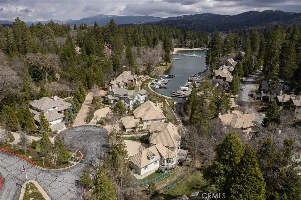 Nestled within a private gated community of only six homes. This stunning residence offers unparalleled tranquility, luxury, and convenience, highlighted by its own triple dock located just steps away. As you approach the home, enjoy the ease of level entry on a peaceful cul-de-sac street, boasting an expansive driveway and oversized 3-car garage. This beautifully refreshed home features all-new exterior and interior paint, plush new carpeting, refinished cabinetry, and stylish gold light fixtures throughout. The heart of this home is the expansive open-concept living area, capturing breathtaking lake views through floor-to-ceiling windows. Rich wood-beamed ceilings, a striking natural local rock fireplace, and freshly carpeted flooring create an inviting ambiance. Adjacent to the main living area is a versatile flex space perfect for intimate conversations, formal dining, or entertainmentideal for a pool table, as previously enjoyed. Gleaming hardwood floors seamlessly connect the flex area to the gourmet kitchen, dining nook, and laundry room. The chef-inspired kitchen features commercial-grade appliances including a signature 6-burner freestanding oven, refreshed cabinetry, and a generous island accommodating up to 8 barstools. Enjoy casual dining in the charming semicircular nook surrounded by windows. A spectacular custom glass-enclosed wine cellar completes this sophisticated culinary space. On the main floor, find a spacious bedroom with custom bay window seating and serene lake views. The adjoining full bathroom showcases timeless tile, contributing to the home's fr