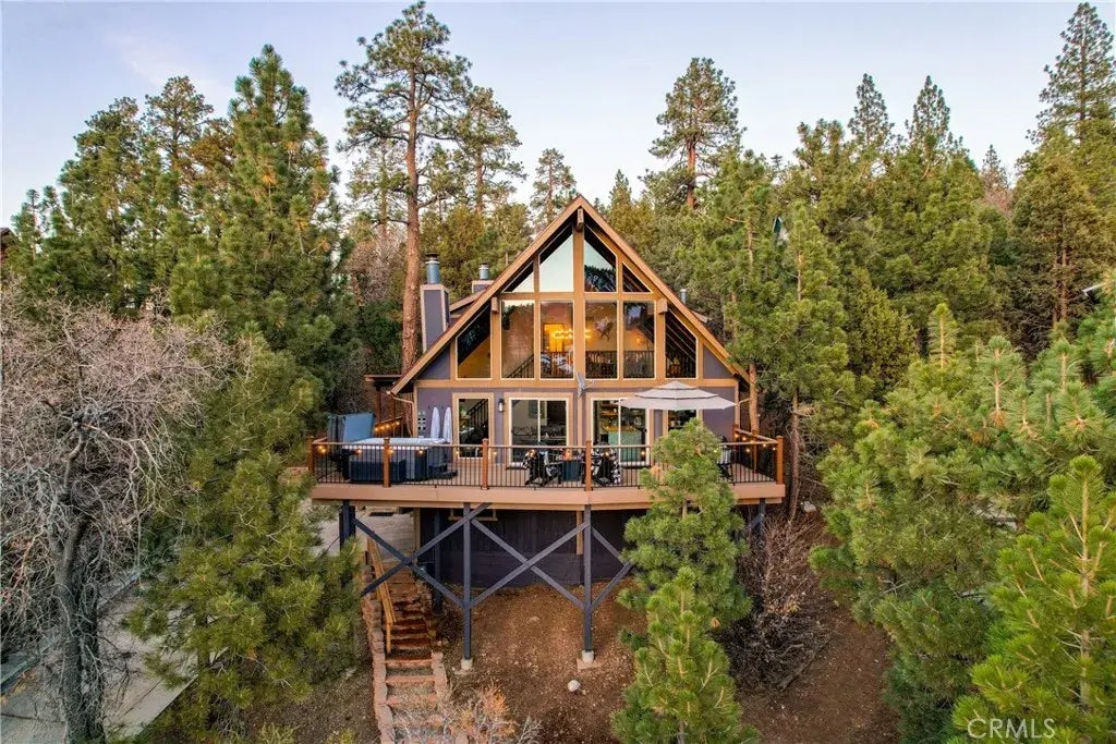 Views Views Views!!! Enjoy stunning panoramic views from this turn-key, one-of-a-kind, beautifully renovated A-Frame Chalet in the heart of Moonridge - just minutes from Bear Mountain Resort, the golf course, Big Bear Alpine Zoo, the National Forest, and great dining. The wall of Chalet-style windows frames breathtaking vistas of Bear Mountain and the National Forest, filling the home with light and mountain ambiance. Inside, youll find soaring vaulted ceilings, a beautifully updated gourmet kitchen with granite counters and modern cabinetry, laminate wood floors, two fireplaces (one in the living room, one in the spacious master suite), and plenty of ways to entertain & unwind. With 3 generous bedrooms and a loft, theres plenty of room for the whole family. Game on! The spacious game room features a pool table, air hockey, poker table, shuffleboard, foosball & a dry bar to wet your thirst. Enjoy the low-maintenance decking, and outdoor spa while you take in the incredible views and gorgeous sunsets. This property has been a popular vacation rental and has a large online following which can convey with the sale. Once owned by Magic Johnson - this rare gem offers luxury, location, and legendary history.
