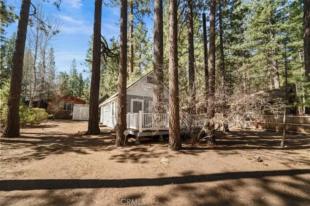LOWER MOONRIDGE! One-bedroom, one-bath mountain cabin nestled in desirable lower Moonridge, just minutes from Bear Mountain slopes and Moonridge Village. Situated on a spacious 7,500 sq. ft. fully fenced lot with beautiful trees, a shed, and a wood shedperfect for mountain living. Inside, enjoy warm wood-paneled walls, beamed ceilings, and a cozy wood stove that enhances the classic cabin feel. A bonus loft adds extra space for guests or storage (not included in square footage). With durable vinyl siding on the exterior, this home is a perfect year-round retreat or rental opportunity in a prime Big Bear location.