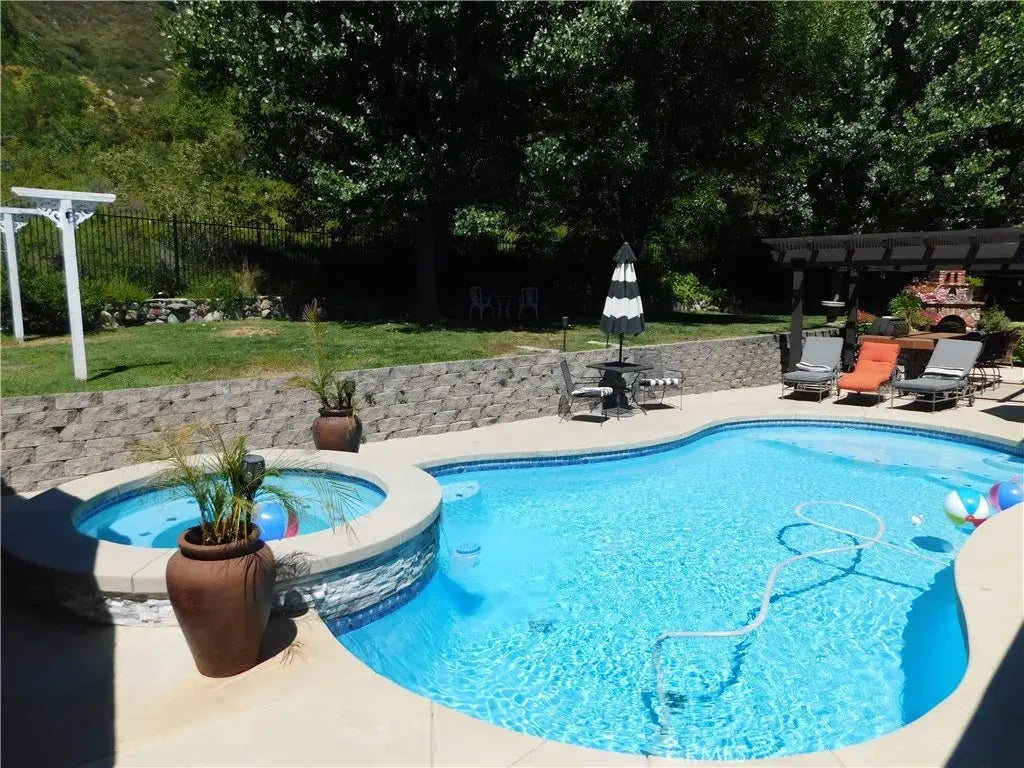 ~ABSOLUTELY SPECTACULAR PRIVATE HOUSE ON THE HILL~ENTERTAINERS DELIGHT OR PERSONAL PARADISE !!!!~STUNNING CUSTOM HOME BUILT IN 2005 ON NEARLY AN ACRE OF LAND~ENDLESS FEATURES AND UPGRADES INCLUDE...CUSTOM STONE & BRICK WALKWAY TO THE GRAND DOUBLE DOOR ENTRANCE, MATCHING STONE & BRICK RETAINING WALLS FRONT AND BACK~SPARKLING INGROUND POOL & SPA INSTALLED IN 2018, POOL HOUSE BAR INSTALLED NOV 2023, PERGOLA RECENTLY REPAINTED WAS BUILT IN 2019, OUTDOOR BBQ WITH NATURAL GAS, BRICK OUTDOOR FIREPLACE WIH NATURAL GAS, FENCED BACKYARD FENCING INSTALLED IN 2018, NEW WATER HEATER IN 2023 PLUS PLANTATION SHUTTERS THROUGHOUT~SUNRUN LEASED SOLAR ONLY $143 A MONTH (TRANSFERRABLE)~HUGE BRIGHT GREAT ROOM WITH WOOD FIREPLACE AND CEILING FAN~ELEGANT WOOD WET BAR WITH MINI FRIDGE, OVERHEAD RECESSED LIGHTING, CEILING FAN PLUS GLASS DOOR LEADING TO BACKYARD PATIO~GOURMET KITCHEN WITH CABINETS AND COUNTER SPACE GALORE WITH GRANITE COUNTERS, OVERSIZED DRAWERS, LADY SUSAN, SEMI WALK-IN PANTRY PLUS BREAKFAST BAR, FUNCTIONAL ISLAND WITH PENDANT LIGHTING AND SINK, BEAUTIFUL BLACK AND STAINLESS APPLIANCES INCLUDE...DOUBLE OVEN, 5 BURNER GAS COOKTOP & HOOD, TRASH COMPACTOR, DISHWASHER, MICROWAVE PLUS A GARDEN WINDOW OVERLOOKING THE SERENE BACKYARD~DOWNSTAIRS LAUNDRY ROOM OFF THE KITCHEN WITH GARAGE ACCESS...WASHER & DRYER INCLUDED~DOWNSTAIRS HAS A FULL SIZE BED & BATH, BATHROOM FEATURES A TUB/SHOWER~UPSTAIRS LEADS TO AN ELEGANT LANDING NOOK AREA~LUXURIOUS MASTER BEDROOM IS KING SIZE WITH A GAS FIREPLACE AND A DOOR THAT LEADS TO THE LARGE PRIVATE BALCONY WHICH OVERLOOKS THE BACKYARD OASIS~SPACIOUS MASTE