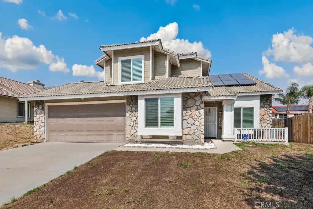 Beautiful 4 bed, 3 bath home is ready for its new owner and offers a spacious floor plan with a neutral paint scheme, plantation shutters, vinyl plank flooring, and Solar Panels! The formal living room features 2-story vaulted ceilings, lots of natural light, and opens to the dining room with modern chandelier and natural wood feature wall. The updated kitchen has white cabinets, quartz counters, recessed lights, and stainless steel appliances including the gas stove and dishwasher. The family room sits just off of the kitchen and has a stacked stone fireplace with wood mantle and there is a sliding glass door to the private backyard. 1 bedroom, 1 bathroom, a large storage closet, and direct garage access door complete the main floor. The upstairs offers a bonus loft area with feature wall and wood beamed ceiling and there are 3 more bedrooms including the large primary suite with built-in window seat area, a walk-in closet, and full-size ensuite with dual sink vanity. There is also a full-size hall bathroom for the secondary bedrooms to share and a hallway linen closet. Enjoy the backyard with covered patio and concrete area - this space is ready for the new owner's design. This home also has an attached 2-car garage and driveway parking for 4 cars. Conveniently located near shopping, dining, schools, parks, hiking/biking trails, and NO HOA! Schedule your tour today!