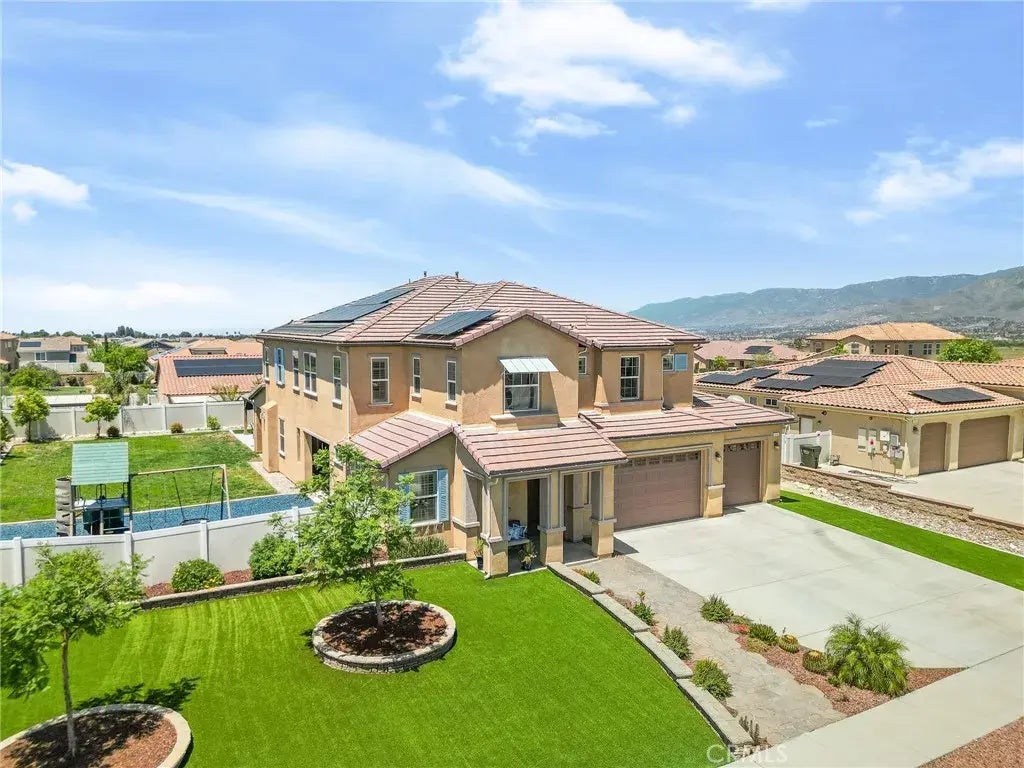 Welcome to your dream home in the heart of Redlands, where elegance meets comfort in a spacious, cheerful setting. This stunning residence features a gourmet kitchen that will delight any chef, complete with a large island and a walk-in pantry, seamlessly flowing into the inviting living room adorned with a cozy fireplaceperfect for gatherings and relaxation. The main level offers two generous bedrooms, one of which boasts an en-suite bathroom for added convenience. Ascend to the upper level to discover the luxurious primary suite, featuring dual sinks, a dedicated make-up area, and an extra-large walk-in closet designed for all your storage needs. You'll also find two additional spacious bedrooms and a large loft area, providing ample room for family and guests. Additionally, the home features Solar, 11 panels are fully owned and 15 additional are with reasonable solar lease, helping you save on energy costs while being environmentally friendly. Current owners receive a rebate back annually. Step outside to experience your own private oasis. The beautifully landscaped yard showcases a California patio and a large pergola, ideal for outdoor entertaining. Dive into the built-in pool or unwind in the above-ground spa, while the children enjoy the wonderful playground and expansive grassy area, all framed by breathtaking mountain views. This expansive yard, primarily landscaped with easy-to-maintain artificial turf, allows you to spend less time on upkeep and more time enjoying your beautiful home. This home sits on a large lot and includes a three-car garage, with plenty of e