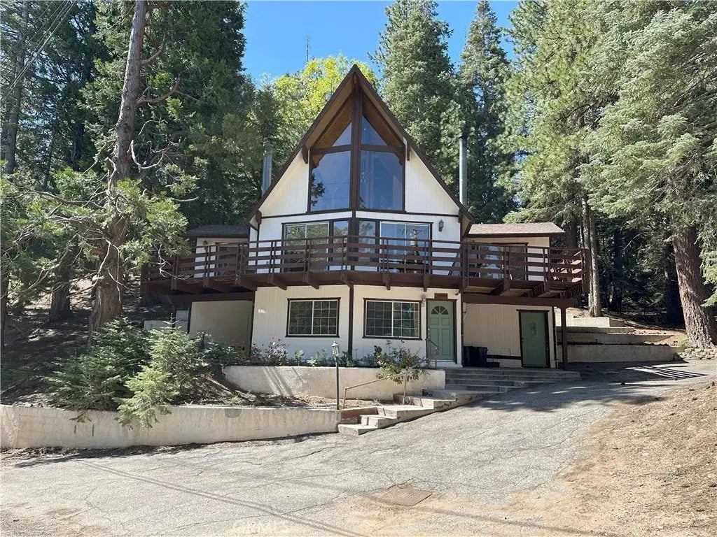 Tucked away on a tranquil cul-de-sac in Running Springs sought-after Upper Rowco neighborhood, this classic tri-level A-frame home offers charm, space, and versatility on a generous 1/4 acre lot. Featuring 4 spacious bedrooms and 2 full bathrooms, the layout is designed for both comfort and entertaining. The entry-level boasts a large bonus room complete with a wet bar and cozy gas log stove perfect for gatherings and game nights. Upstairs, the open-concept living and dining area welcomes you with soaring vaulted ceilings, exposed wood beams, an eye-catching stone fireplace, and oversized windows that flood the space with natural light. Dual sliding doors open to a large wraparound deck, perfect for enjoying the fresh mountain air. The private top-level primary suite includes its own bathroom and a balcony retreat. Outside, the backyard offers a secluded setting with plenty of space to unwind or play. Conveniently located on a wide paved road, this home enjoys easy year-round accessand thanks to the nearby snowplow storage facility, its among the first streets cleared in winter. Just minutes from town amenities, ski resorts, and Highway 18, this property blends mountain serenity with everyday convenience. Priced below market value, this home is an incredible opportunity you won't want to miss. Schedule your showing today and submit your offer before it's gone!