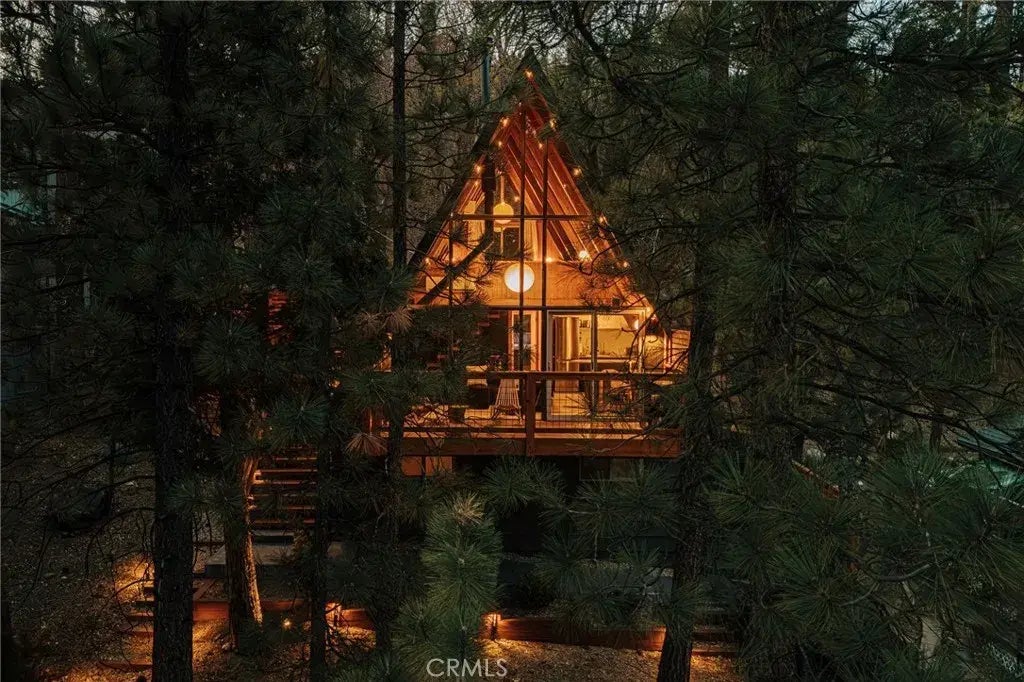Lovingly transformed with over $100,000 in upgrades, this iconic A-frame cabin blends 1960s character with a modern eye. Morning light filters through a wall of glass as you sip your coffee, wrapped in a cozy blanket, the hush of the forest just beyond the deck. The scent of cedar lingers from the crackling firewood, and somewhere overhead, birds greet the day. This is more than a cabinits a rhythm, a mood, a retreat. Every detail has been intentionally curatedfrom the handcrafted oak staircase and floating treads to the sculptural wood stove that anchors the living room in warmth and style. Clean lines and natural textures meet in a way that feels both editorial and effortless. The main floor offers an open layout with new flooring, doors, designer lighting, and a minimalist kitchen that quietly impresses. Downstairs, a fully separate guest suite with its own bath welcomes visitors. Step outside and you're surrounded by nature. New decks invite slow mornings and your favorite sunset beverage. The fire pit and hot tub glow at dusk, offering pure relaxation beneath string lights and starlit skies. Over 250 feet of new fencing wrap the yard with both intention and privacy. Fresh landscaping with irrigation, sheds for bikes and firewood, a 4-car driveway, a tankless water heater, and a new 200-amp electrical panel ensure every practical box is checked. Backing to open acreage for that rare nowhere else feelingyet just moments from Big Bear Lake, Dana Point Park, North Shore Caf, marinas, and iconic National Forest trailheads including Greys Peak and Butlers Peak. Groceries and
