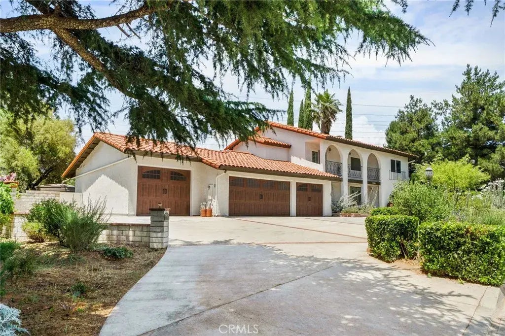 Standing proudly on nearly half-acre with mountain views, this distinctive two-story home offers privacy and space along a peaceful street lined with towering conifers. Classic arched entrance, circular driveway, new faux-walnut carriage doors, and native California landscaping signal a home built for discerning buyers. Grand foyer with wraparound staircase leads to durable porcelain tile throughout main level. Formal dining room perfect for intimate dinners, while living room centers around welcoming fireplace with French doors opening to large screened patiospacious enough for multiple seating areas and entertaining. Remodeled kitchen for serious cooks features double oven, separate oversized fridge and freezer, five-burner gas cooktop, farmhouse sink, and engineered quartz counters. Built-in floating shelves provide for elegant display. The showstopper: 900 sq ft great room flooded with light from six skylights. Vaulted ceiling supports properly sized fan, engineered hardwood leads to second fireplaceperfect space for large gatherings, art studio, or media room. Upstairs, spacious primary suite has vaulted ceilings and newly resurfaced balcony for morning coffee and sunrise views. Loft includes built-in workspace, plus two additional bedrooms. Resort-style backyard centers around PebbleTec pool with spa waterfall, new lighting, new filter and variable-speed pumpsurrounded by mature landscaping for privacy. Gardeners' dream: orchard produces 60+ varieties from more than 50 trees, including rare fruits you can't buy in stores. Add critter-proof screened garden, raised beds