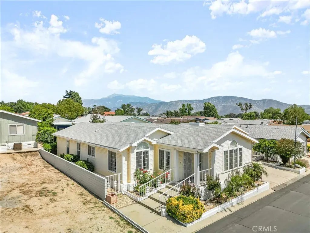 Gorgeous Triple-Wide Manufactured Home is Turnkey and so Spacious with 1900 square feet of Living Space. Lots of Curb Appeal with a Rose Garden and Covered Front Porch. Plantation Shutters thru-out. Walls are Drywall and no paneling! Vaulted Ceilings and 6-Panel Doors. Wood Laminate Flooring thru-out with Carpet in Living Room and Primary Bedroom. Living Room features Raised Hearth Gas Fireplace with Mantle. Formal Dining Room has Built-in Hutch with Lighting and is open to the Kitchen and Living Room. Light and Bright Kitchen with Breakfast Nook has Tiled Countertops, 2 Pantries, D/W and Stainless Steel 5-Burner Gas Range and Refrigerator. Huge Primary Bedroom with Spacious Retreat has Double-Door Entry, Two Closets with Mirrored Sliding Doors and Ceiling Fan. The Retreat has Built-in Shelving and could be used as an Office or Personal Gym. Primary Bathroom has Double-Sinks, Jetted Tub and Separate Walk-in Shower. Guest Bedroom is very Spacious. Guest Bathroom has Tub/Shower and a second door leading to the Laundry Room. Den is very Spacious with Built-in Shelving and Cabinets. Interior individual Laundry Room has Sink and Deep Cabinets. Just a couple steps across the Breezeway to the 2-Car Detached Garage with Built-in Shelves and Roll-up Door with Remote. Full-Sized Driveway which is rare! PARKING FOR 4 CARS! Covered Patio spans across the width of the Garage and overlooks lush Grassy area. Mountain Springs is a 55+ community and the Amenities include a Clubhouse, Swimming Pool, Tennis Courts and Pickle Ball Courts. Close to Freeway, Shopping, Hospital, Restaurants, Movi