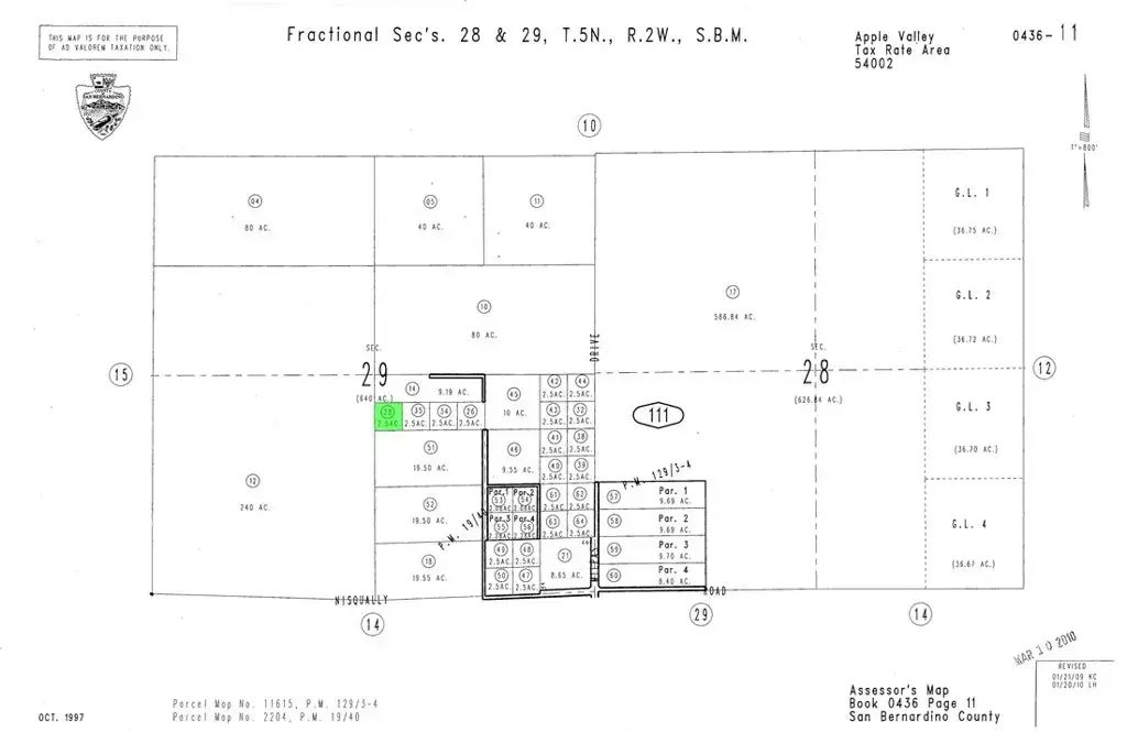 There is not an address associated with this parcel. What is reflected is the Parcel# 0436-111-28-0000 which is +/-2.5 Acres. Zoning is RL (Rural Living). Located outside of the town limits of Apple Valley, the PIQ is in Unincorporated San Bernardino County. The Southwest 1/4 of the Northwest 1/4 of the Northwest 1/4 of the Southeast 1/4 of Section 29 Township 5 North, Range 2 West, San Bernardino Base and Meridian, County of San Bernardino.