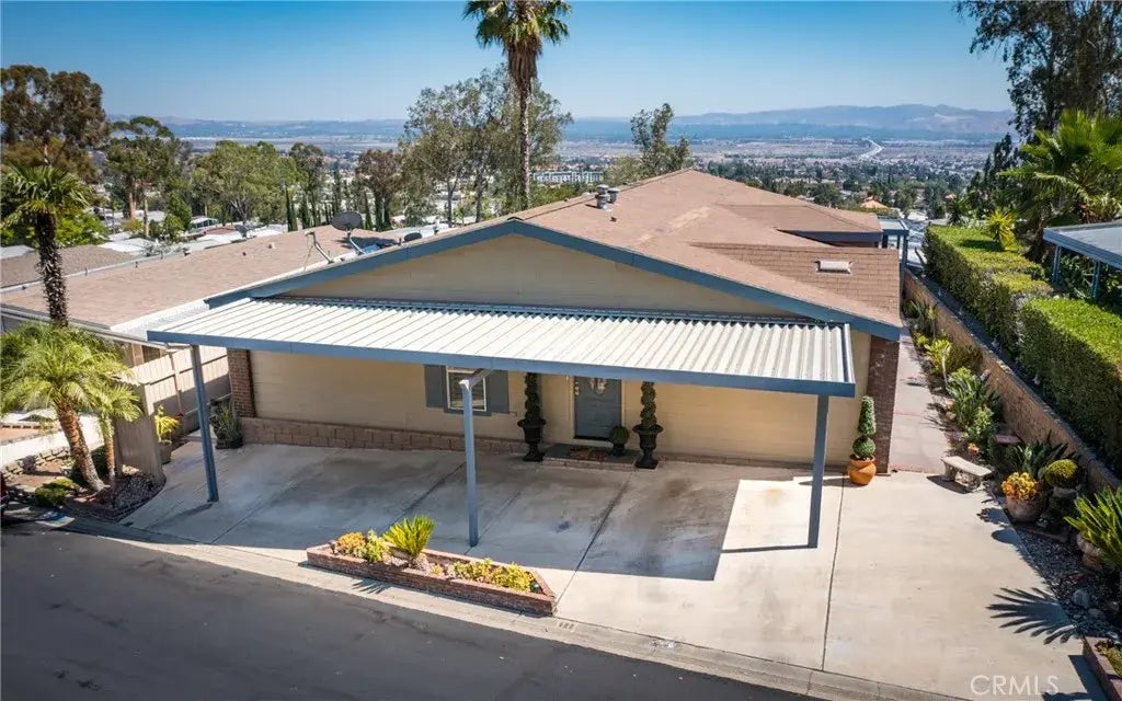 One of a kind, beautiful home in Mountain Shadows 55+ SENIOR park. OPEN CONCEPT kitchen in the middle of the extra large living room and large family room. Enjoy your coffee in the cute breakfast nook while enjoying the beautiful view of the valley. SHUTTERS grace all the windows, crown molding, extra large baseboards, wainscot on formal dining area. Walk in shower in Hall bathroom with custom shower doors. Guest room has large walk in closet for that extra storage. Third bedroom is an office with built in desks and cabinet. Primary bedroom has a very large and welcoming tub with separate shower. The walk-in closet is perfect. The laundry room has a 36 inch backdoor opening to the car port. The home was extended when new and the square footage was enlarged in the living area. A wall was removed to make the living area bigger. Wall can be put back if you need a 4th craft/bedroom. Extra insulation was added to the outside walls when new. The view from the front porch is breathtaking and the large shed adds storage space. Come see it today.