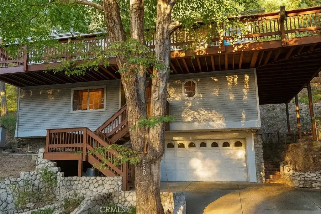 Welcome to your ultimate mountain retreat, just minutes from the tranquil shores of Lake Gregory. This lovingly maintained home showcases true pride of ownership, offering a spacious primary suite with a walk-in closet, a beautifully appointed bathroom, and direct access to a serene, half-acre backyard. Step outside to a rare and inviting outdoor setting featuring a natural year-round spring that flows through handcrafted stoneworkcreating multiple peaceful spots to relax and enjoy the soothing sound of running water. Elevated above the yard, a large Trex deck sits nestled among mature pine, cedar, and oak trees, complete with a built-in natural gas BBQperfect for outdoor dining and relaxation. Inside, you'll find a warm and welcoming living area with a granite fireplace, red oak flooring, and abundant windows that fill the space with natural light. The kitchen is designed with connection in mind, featuring a generous island and a seamless, open layout ideal for gathering with friends and family. Each of the two additional bedrooms is a private suite with its own bathroom and ample closet space, providing comfort and privacy for guests or family members. Additional features include a whole-house automatic generator, central air conditioning, an electric crane to lift firewood/heavy objects to and from top deck, motorized window coverings, centarl vacuum system, a walk-in pantry, stairlifts between every level, generous parking, a two-car garage, an outdoor storage shed, and more. You will not want to miss out on this rare gem!