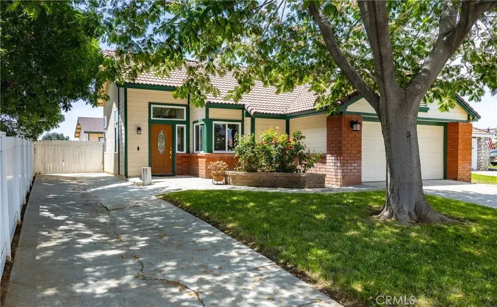 Welcome home. This beautiful home has a lot to offer. New flooring and fresh interior paint throughout. Upon entering, the cozy living room has tons of natural light and a cosmetically upgraded fireplace. The brand-new tile runs throughout the whole house including the bathrooms. The kitchen and dining area are nestled together with plenty of cabinet space and a huge sliding glass door leading to the backyard. Both bedrooms have brand new carpet. The primary bedroom is very spacious with beautiful natural light and has a large sliding glass door leading to the backyard. The primary bedroom also has a walk-in closet. The laundry is located in the two-car garage. The backyard has a covered patio and a lot of concrete which is great for entertaining and low maintenance. There is also a very large, detached garage/workshop in the backyard. The side yard has drive-thru RV access and RV parking. There are fruit trees including pomegranate, apricot, plum and a fig tree as well.