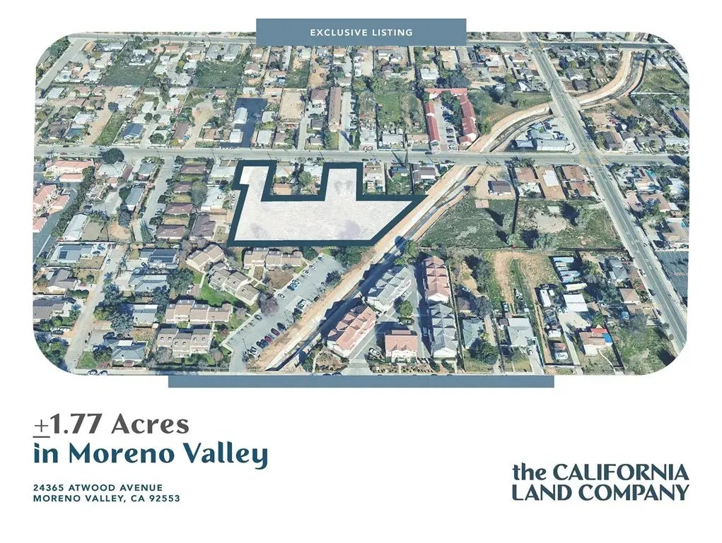 The California Land Company is pleased to present the opportunity to acquire a 1.77-acre site located at 24365 Atwood Avenue in the City of Moreno Valley. The property is currently unimproved and is situated within The Village Specific Plan (SP 204), with a zoning designation of Village Residential (VR). The sites General Plan land use designation is R20 Residential, which allows for a maximum density of 20 dwelling units per acre. A variety of residential product types are possible, including single-family homes, townhomes, or multifamily. The seller is open to traditional, quick-close offers and prefers not to entertain proposals requiring time to process entitlements.
