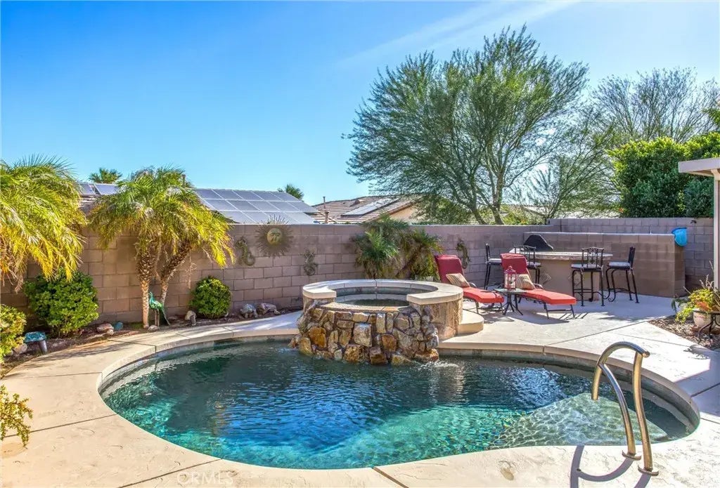 Stunning Heated Saltwater Pool Home with Paid-Off Solar in Gated Mountain Gate Community. Welcome to this beautifully upgraded single-story home located in the highly sought-after Mountain Gate Communitywhere resort-style living meets everyday comfort. With paid-off solar panels and no electric bill, this energy-efficient home offers luxury, savings, and style. Step inside to a bright and open-concept layout featuring a modern kitchen with quartz countertops, tile flooring, custom backsplash, and a sleek galley islandideal for both casual dining and entertaining. The spacious family room boasts elegant plantation shutters, updated fixtures, and a cozy gas fireplace. The primary suite is a peaceful retreat with a large walk-in closet and private slider to the backyard oasis. The upgraded bathrooms feature quartz counters, new sinks, and beautifully tiled showers. Additional upgrades include an insulated garage, whole-house water softener, and a reverse osmosis water purifier. Outside, enjoy breathtaking mountain views from your private paradise, complete with a saltwater pool with a built-in lounging area, spillover spa, built-in BBQ, and a covered patioperfect for relaxing or entertaining. Mountain Gate is a gated community with low HOA dues and top-notch amenities including multiple pools, parks, basketball courts, walking trails, and pickleball courts. Conveniently located near Hwy 111, youre just minutes from downtown Palm Springs, the Aerial Tramway, shopping, dining, and more. Dont miss your chance to own this move-in-ready, energy-efficient gem in one of Palm Springs