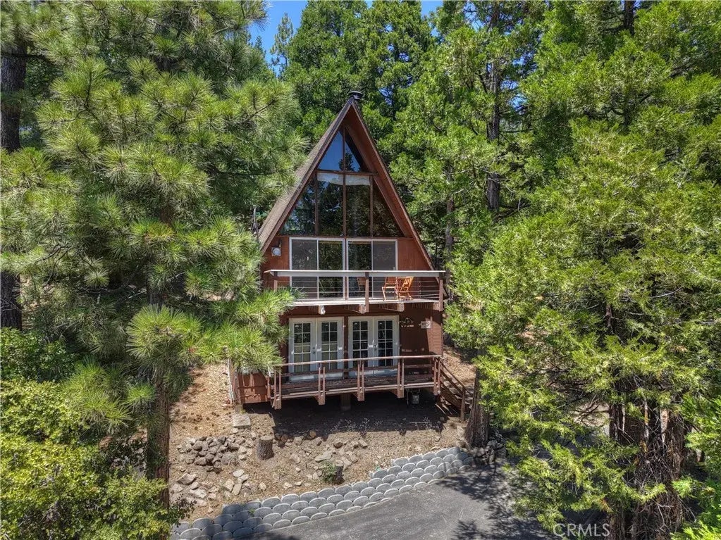 A-frame cabin nestled amongst the trees. The home has kept most of its retro vibes which some will adore. The home has that time capsule feel and fun nostalgic atmosphere. Beautiful views of the mountains from the deck and living room. Gorgeous, beamed wood ceilings. Staircase has that beautiful wall of wood slats for that midcentury feel. Also under the stairs is a secret hatch that enters the buildup; ladder was removed at some point. You enter the A-frame from the backside which also has a nice sitting deck. Front door opens to a hall with bedroom on the left and bathroom on the right. Kitchen faces the living room and has a pantry closet across the hall. In front of the kitchen, you have a dining space. To your left is the living room with its show stopping MCM wood burning fireplace with a lovely silhouette. Upstairs you have a loft bedroom that looks out onto the trees and sky. Finally, there is the lower part of this home. The buildup is quite large and could be something more for those with the gusto to do so. This the A-frame to retreat to. Come see it soon because it will not last.