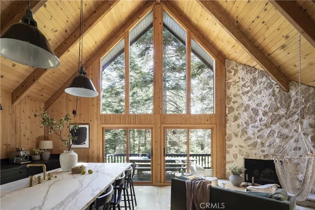 Welcome to the Modern Lodge. A dreamy designer cabin tucked in the trees of the San Bernardino Mountains. This 3 bedroom, 2 bath retreat has been fully renovated and professionally designed by Sarah Solis, blending natural textures, rich tones, and high end finishes into a space that feels warm, moody, and intentional. Every inch has been curated, from the custom tile and warm woodwork to the top of the line appliances and luxe fixtures, including Waterworks faucets. Defining the living space is a beautiful floor to ceiling stone fireplace, designed for slow mornings, cold winter nights, and cozy conversations. Expansive windows bring the outside in, framing forest views and filling the home with natural light. Tucked on a peaceful, county maintained road near the golf course, and just minutes from the Village, Snow Valley, and SkyPark, youre perfectly positioned for year round adventure. And yes, lake rights are included! A full time retreat. A weekend escape. A stylish, fully furnished property with income potential. This ones a rare find.