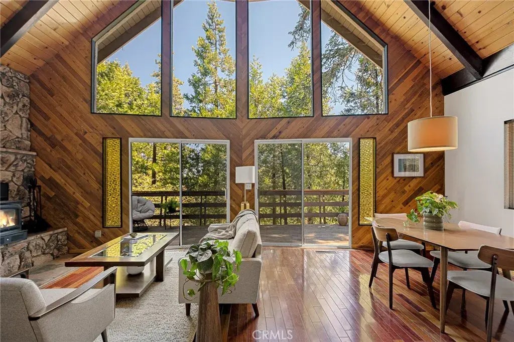 On the market for the first time in nearly 30 years, you are invited to step back in time with this incredibly preserved 1970s cabin that delivers nostalgic vibes with all the right updates. Tucked away among the pines on a beautifully treed lot, this 2-bedroom plus loft getaway radiates retro cool while offering modern touches where it counts. The roomy downstairs bedroom currently serves as a den, designed for kickin back in true 70s stylethink vinyl spinning, game nights with friends, working on macram, and all-around good times in a space made for memories. The primary bedroom and full bathroom are conveniently located on the main level, while a 3/4 bath is tucked away in the loft spaceideal for guests or extra privacy. The heart of the home is a soaring prow-front living room with dramatic beamed ceilings and a wall of glass that frames the forest and captures magical sunsets from the tree-top deck. Warm wood accents wrap the space in retro coziness, perfectly complemented by the original vintage amber bubble glass windows that add a warm, nostalgic glow and timeless character throughout the cabin. The kitchen has been tastefully remodeled, blending new convenience with the cabins original soul. The open loft offers extra space to sleep, work, or play. Off-street parking for two adds convenience and ease for you and your guests. This is more than a homeits a vibe. Whether you're looking for a cool weekend escape, a standout short-term rental, or a full-time mountain hideaway with lake rights, this vintage treasure box is ready to welcome you home.