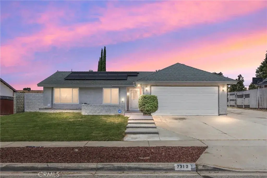 Freshly remodeled and move-in ready, this versatile 6-bedroom, 3-bathroom home offers flexible living combined with a separate attached ADU. The main home includes 4 bedrooms and 2 full bathrooms, while the ADU adds 2 additional bedrooms, a full bath, and its own private entrance ideal for extended family or guests. Enter through the front door into a spacious living room with vaulted ceilings and a gas fireplace, creating an open and welcoming feel. This main gathering space flows seamlessly into the dining area and updated kitchen featuring white granite countertops, brand-new cabinetry with dual corner lazy Susans, and added counter and storage space near the dining area. The dining space connects directly to the enclosed rear patio through sliding glass doors, offering an easy indoor-outdoor flow. Down the hallway are three secondary bedrooms all with ceiling fans, and a shared full bath with a newly tiled shower/tub combo. The primary suite sits at the rear of the home and includes an extended closet, ceiling fan, sliding door access to the yard, and a private bath with a tiled walk-in shower and updated vanity. A whole house fan is also located in the hallway for added ventilation. The attached ADU has its own kitchen area with cabinet storage, sink, and space for a refrigerator, as well as two bedrooms and a full bath with a walk-in tiled shower. It has a spacious indoor laundry area and private entry via the front porch, in addition to interior access from the main house. The rear yard is fully fenced and features a large fully enclosed covered patio with new tile