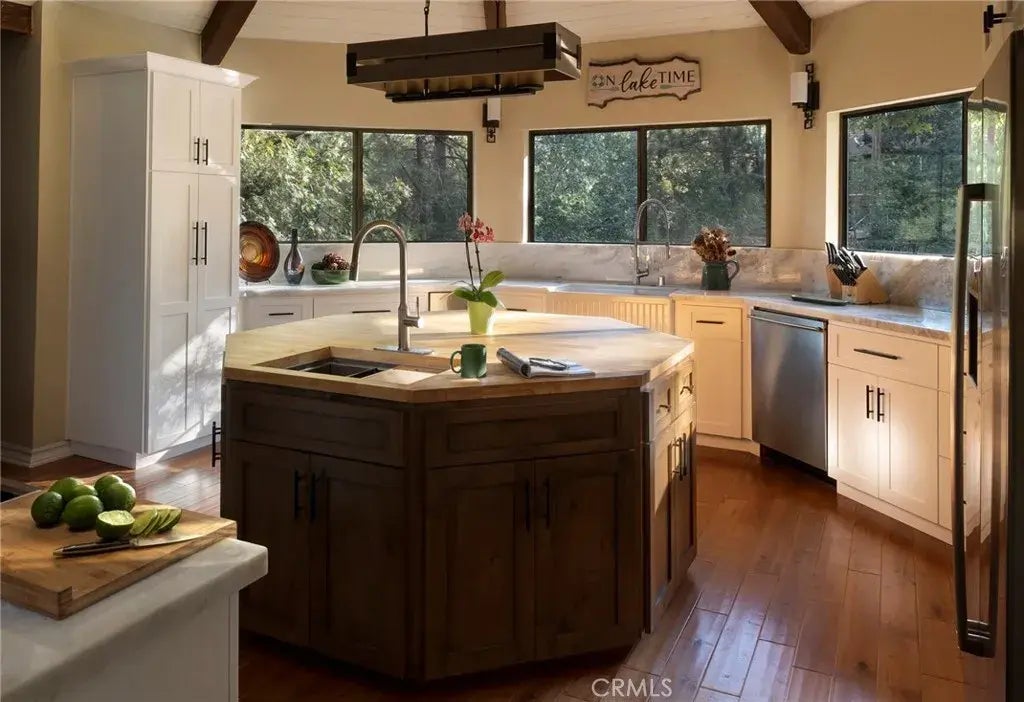 First Tier Dream Retreat in the gated and lakeside community of North Shore Estates. This craftsman-style lake house offers modern luxury in a picturesque locale. A tremendous Value in this Coveted Community! Just a short stroll to your half double dock located at the top of Winter Harbor (available for additional purchase). The dock is in the perfect location to watch the 4th of July fireworks. The heart of the home is the newly remodeled kitchen with a stunning octagonal butcher block island. Stainless steel appliances and quartzite countertops grace the kitchen, while (engineered) hardwood flooring adds sophistication throughout. The charming residence features three guest suites, one with a separate walk-in shower and spa tub, plus a convenient office or fourth bedroom. The master suite is a true oasis with a private viewing deck and a spacious bath boasting a walk-in shower and clawfoot tub. The beamed and vaulted ceilings pair with extensive use of windows to capture mountain wildlife and tree views. Plantation shutters, air conditioning, and a full house generator provide comfort and convenience. For cozy evenings, gather around the massive wall-to-wall, floor-to-ceiling fireplace with its stunning log-style mantle in the sunken living room. Ample parking ensures you, your guests and your boat have space out of the way. Don't miss the opportunity to make this lakeside retreat in sought after North Shore Estates your own. Contact us now to discover the serenity of life in this knitted community. Your dream lake house awaits in Lake Arrowhead, CA.